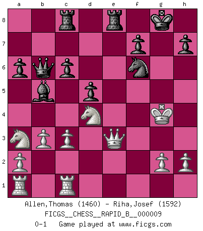 Last move : 0-1 2006 October 5 4:56:22 [Event "FICGS__CHESS__RAPID_B__000009"] [Site "FICGS"] [Date "2006.07.11"] [Round "1"] [White "Allen,Thomas"] [Black "Riha,Josef"] [Result "0-1"] [WhiteElo "1460"] [BlackElo "1592"] 1.d4 d5 2.Bf4 c5 3.e3 Nc6 4.c3 Bf5 5.Nf3 e6 6.Bb5 Qb6 7.Qa4 a6 8.Bxc6+ bxc6 9.b3 Rc8 10.O-O Bd3 11.Rc1 Bb5 12.Qa3 cxd4 13.Bd6 Bxd6 14.Qxd6 dxe3 15.Nd4 exf2+ 16.Kxf2 Nf6 17.Qf4 Ne4+ 18.Kf3 O-O 19.Na3 e5 20.Qxe5 Rfe8 21.Qf4 g5 22.Qe3 g4+ 23.Kxg4 Nf6+ 0-1 This chess game has been lost on time (started : 2006.07.11 13:21:13) Queen's pawn, Mason variation, Steinitz counter-gambit Kingside Castling by player White (move 10) Kingside Castling by player Black (move 18) Player Black won this chess game. Follow this game move after move (download)A great player and a great example for many. His book My 60 Memorable Games had a big impact on me. It is a shame he didn't continue to enrich the world of chess with his unparalleled understanding after 1972. (Jan Timman, about Bobby Fischer's death) Das Zentrum ist der Balkan des Schachbretts - Kriegshandlungen können in jedem Moment ausbrechen. (Aaron Nimzowitsch) Debes de llevar a tu oponente hacia un profundo y obscuro bosque donde 2+2=5, y el camino que conduce a la salida es suficientemente ancho para solamente uno. (Mikhail Tal) A chaque perte on perd un peu de soi. (Joël Lautier) Political correctness is subjecting us to gross incompetence. (Johann Piek)