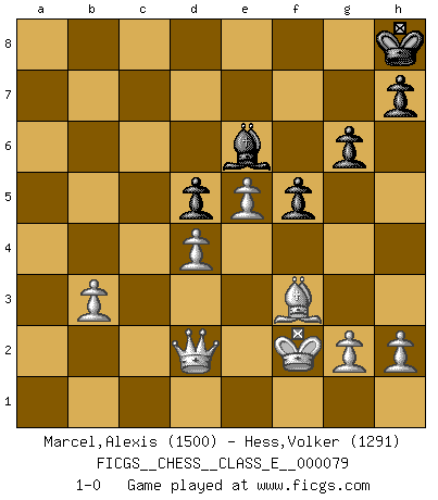 Last move : 1-0 2008 April 7 17:2:9 [Event "FICGS__CHESS__CLASS_E__000079"] [Site "FICGS"] [Date "2008.03.30"] [Round "1"] [White "Marcel,Alexis"] [Black "Hess,Volker"] [Result "1-0"] [WhiteElo "1500"] [BlackElo "1291"] 1.f4 d6 2.Nf3 Nf6 3.b3 g6 4.Bb2 Bg7 5.e3 O-O 6.Be2 Nc6 7.O-O e5 8.Nc3 Ne8 9.a3 f5 10.fxe5 Nxe5 11.a4 Kh8 12.Nxe5 Bxe5 13.d4 Bf6 14.Bf3 c6 15.Ba3 Nc7 16.Re1 Be6 17.Qe2 Re8 18.e4 d5 19.e5 Be7 20.Bxe7 Qxe7 21.Qe3 Na6 22.Na2 Nb4 23.Nxb4 Qxb4 24.Rab1 a5 25.c3 Qe7 26.Qd2 Rec8 27.Ra1 b5 28.axb5 cxb5 29.Ra2 Qc7 30.Rc1 b4 31.Rac2 bxc3 32.Rxc3 Qb7 33.Rxc8+ Rxc8 34.Rxc8+ Qxc8 35.Qxa5 Qc1+ 36.Kf2 Qd2+ 37.Qxd2 1-0 Bird's Opening Kingside Castling by player Black (move 5) Kingside Castling by player White (move 7) Player White won this chess game. Follow this game move after move (download)Chess is a terrible game. If you have no center, your opponent has a freer position. If you do have a center, then you really have something to worry about ! (Siegbert Tarrasch) Wie ich sie so einen nach dem anderen nieder mähte wurde meine Überlegenheit offensichtlich. (José Raúl Capablanca) El Ajedrez es una hermosa aventura. (Bent Larsen) Des points faibles ou des trous dans la position de l'adversaire doivent être occupés par des pièces et non pas par des pions. (Siegbert Tarrasch) The existence of forgetting has never been proved: We only know that some things don't come to mind when we want them. (Friedrich Nietzsche)