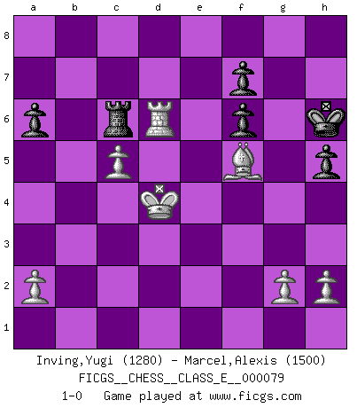 Last move : 1-0 2008 May 7 8:3:41 [Event "FICGS__CHESS__CLASS_E__000079"] [Site "FICGS"] [Date "2008.03.30"] [Round "1"] [White "Inving,Yugi"] [Black "Marcel,Alexis"] [Result "1-0"] [WhiteElo "1280"] [BlackElo "1500"] 1.f4 e5 2.fxe5 d6 3.Nf3 Bg4 4.Nc3 Bxf3 5.exf3 dxe5 6.Bb5+ c6 7.Bd3 Nf6 8.b3 Be7 9.Qe2 Nbd7 10.O-O O-O 11.Bb2 Qc7 12.Rae1 Bd6 13.Ne4 Nxe4 14.Qxe4 Qb6+ 15.Kh1 Nf6 16.Qf5 Rfe8 17.f4 Qc5 18.fxe5 Bxe5 19.Rxe5 Rxe5 20.Bxe5 Re8 21.Bxf6 Qxf5 22.Bxf5 gxf6 23.Kg1 Re2 24.Rd1 h5 25.d4 Kg7 26.Kf1 Re7 27.Kf2 b5 28.c4 a6 29.d5 cxd5 30.Rxd5 bxc4 31.bxc4 Ra7 32.c5 Rc7 33.Ke3 Rc6 34.Kd4 Kh6 35.Rd6 1-0 Bird : From gambit Kingside Castling by player White (move 10) Kingside Castling by player Black (move 10) Player White won this chess game. Follow this game move after move (download)A bad plan is better than none at all. (Frank Marshall) Fischer machte Schach einfach zu einer aufregenden Sache, wann immer er sich ans Brett setzte. (Raymond Keene) Todo se encuentra en un estado de flujo y esto incluye al mundo del Ajedrez. (Mikhail Botvinnik) Les Echecs sont affaire de jugement sensible. Savoir quand frapper et quand esquiver. (Fischer) If things go wrong, don't go with them. (Roger Babson)