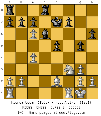 Last move : 1-0 2008 April 5 12:9:33 [Event "FICGS__CHESS__CLASS_E__000079"] [Site "FICGS"] [Date "2008.03.30"] [Round "1"] [White "Florea,Oscar"] [Black "Hess,Volker"] [Result "1-0"] [WhiteElo "1507"] [BlackElo "1291"] 1.d4 d6 2.c4 e5 3.dxe5 dxe5 4.Qxd8+ Kxd8 5.Nc3 Be6 6.e4 Bd6 7.Nf3 Ke7 8.Be2 Nf6 9.O-O Rd8 10.Bg5 h6 11.Bh4 g5 12.Bg3 Nc6 13.Nd5+ Bxd5 14.exd5 Nh5 15.dxc6 Nxg3 16.fxg3 1-0 Old Indian defense Kingside Castling by player White (move 9) Player White won this chess game. Follow this game move after move (download)When you don't know what to do, wait for your opponent to get an idea - it's sure to be wrong. (Tarrasch) Die starken Figuren des Gegners muss man abtauschen. (José Raúl Capablanca) Robert Fischer es la ley hacia si mismo. (Larry Evans) Botvinnik disait en comparant les échecs à la musique: Il existe une science dont le but est l'étude de l'acoustique et des sons. Mais il y a aussi un art qui se sert de l'océan des sons : c'est la musique. De toute évidence, il en est de même pour la pensée. La logique est l'étude des lois de la réflexion et les échecs reflètent, en tant qu'art, le côté logique de la réflexion, sous la forme d'images artistiques... Extrait de Fischer - Spassky, Reykjavik 1972 par Alexander & F. Wyndham (Ed. Solar), p 37. A good aphorism is too hard for the tooth of time, and is not worn away with the centuries, although it serves as food for every speech. (Friedrich Nietzsche)