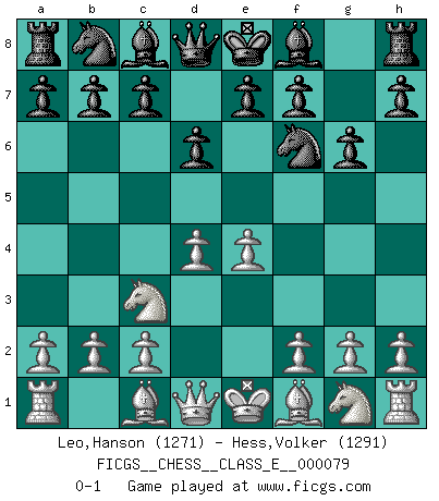 Last move : 0-1 2008 May 10 9:32:18 [Event "FICGS__CHESS__CLASS_E__000079"] [Site "FICGS"] [Date "2008.03.30"] [Round "1"] [White "Leo,Hanson"] [Black "Hess,Volker"] [Result "0-1"] [WhiteElo "1271"] [BlackElo "1291"] 1.d4 d6 2.e4 Nf6 3.Nc3 g6 0-1 This chess game has been lost on time (started : 2008.03.30 7:2:43) Queen's Pawn Player Black won this chess game. Follow this game move after move (download)After black's reply to 1.e4 with 1..e5, leaves him always trying to get into the game. (Howard Staunton) Das typische an einem Großmeister ist, daß er eine gewonnene Position schnell und schmerzlos gewinnt. (Irving Chernev) El Ajedrez era la lengua materna de Capablanca. (Reti) Nous sommes les pions de la mystérieuse partie d'Echecs jouée par Dieu. Il nous déplace, nous arrête, nous pousse encore, puis nous lance un à un dans la boîte du Néant. Epitaphe sur la tombe de David Janowsky (1868-1927). If you have any trouble condescending, find a Unix user to show you how it's done. (Scott Adams)