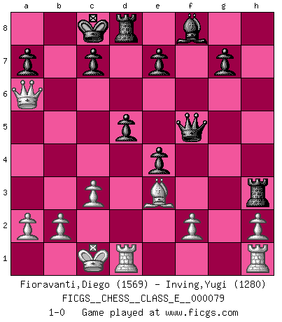 Last move : 1-0 2008 July 13 2:50:44 [Event "FICGS__CHESS__CLASS_E__000079"] [Site "FICGS"] [Date "2008.03.30"] [Round "1"] [White "Fioravanti,Diego"] [Black "Inving,Yugi"] [Result "1-0"] [WhiteElo "1569"] [BlackElo "1280"] 1.Nc3 Nf6 2.e4 Nc6 3.d4 d5 4.e5 Ne4 5.Nxe4 dxe4 6.Ne2 Bg4 7.c3 Qd7 8.Qc2 O-O-O 9.Qxe4 f6 10.Ng3 h5 11.Bb5 h4 12.Bxc6 bxc6 13.Nf1 h3 14.gxh3 Bf5 15.Qe2 Kb7 16.Ng3 Rxh3 17.Be3 fxe5 18.O-O-O e4 19.d5 cxd5 20.Nxf5 Qxf5 21.Qb5+ Kc8 22.Qa6+ 1-0 Dunst (Sleipner, Heinrichsen) Opening Queenside Castling by player Black (move 8) Queenside Castling by player White (move 18) Player White won this chess game. Follow this game move after move (download)You know you're going to lose. Even when I was ahead I knew I was going to lose. - On playing against Fischer. (Andrew Soltis) Karpov ist ein Museumsstück. (Garry Kasparov) Si tu oponente no puede hacer nada activo, entonces no apures la posición; En vez de eso, dejalo estar sentado ahí, sufriendo y rogandote por un empate. (Jeremy Silman) Aux échecs, l'amour-propre est satisfait quand on remporte la victoire, mais il n'y a pas de honte à être battu. (Benjamin Franklin) A woman without a man is like a fish without a bicycle. (Gloria Steinem)