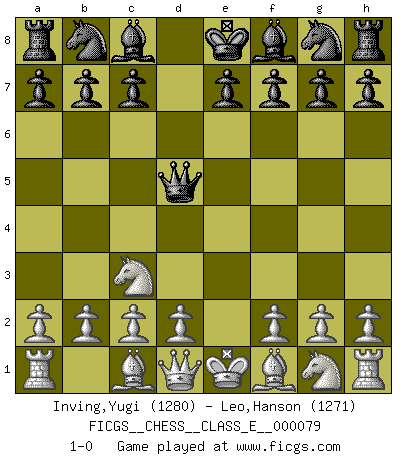 Last move : 1-0 2008 May 11 9:33:1 [Event "FICGS__CHESS__CLASS_E__000079"] [Site "FICGS"] [Date "2008.03.30"] [Round "1"] [White "Inving,Yugi"] [Black "Leo,Hanson"] [Result "1-0"] [WhiteElo "1280"] [BlackElo "1271"] 1.e4 d5 2.exd5 Qxd5 3.Nc3 1-0 This chess game has been lost on time (started : 2008.03.30 7:2:43) Scandinavian (centre counter) defense Player White won this chess game. Follow this game move after move (download)In order to improve your game, you must study the endgame before everything else, for whereas the endings can be studied and mastered by themselves, the middle game and the opening must be studied in relation to the endgame. (Jose Raul Capablanca) Ich hatte Angst gegen einen russischen Großmeister zu verlieren, und er befürchtete gegen einen kleinen Jungen zu verlieren. (über ein Remis gegen Juri Awerbach). (Robert James Fischer) El Ajedrez es el gimnasio de la mente. (Blaise Pascal) Horreur, mais aussi harmonie suprême : qu'y avait-il en effet au monde en dehors des échecs ? Le brouillard, l'inconnu, le non-être... (Vladimir Nabokov) There's no money in correspondence chess. (John Knudsen)