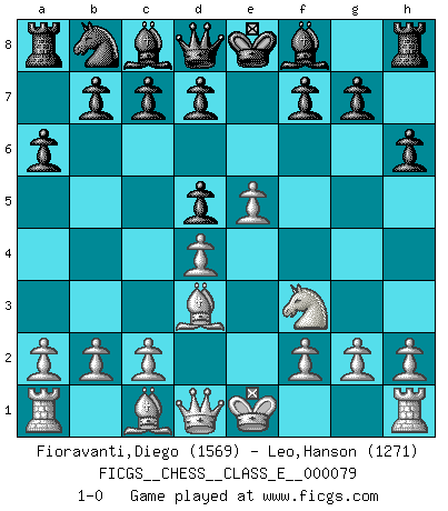 Last move : 1-0 2008 May 10 9:32:18 [Event "FICGS__CHESS__CLASS_E__000079"] [Site "FICGS"] [Date "2008.03.30"] [Round "1"] [White "Fioravanti,Diego"] [Black "Leo,Hanson"] [Result "1-0"] [WhiteElo "1569"] [BlackElo "1271"] 1.Nc3 e6 2.d4 h6 3.e4 a6 4.Bd3 Nf6 5.e5 Nd5 6.Nxd5 exd5 7.Nf3 1-0 This chess game has been lost on time (started : 2008.03.30 7:2:43) Dunst (Sleipner, Heinrichsen) Opening Player White won this chess game. Follow this game move after move (download)There is only one thing Fischer does in Chess without pleasure: to lose ! (Boris Spassky) Zu meiner Zeit war ein 20 jähriger ein junger Spieler, heute ist er ein Veteran. (Garry Kasparov) Si pudieramos observar el interior de la cabeza de un jugador de Ajedrez, encontraríamos ahí un mundo lleno de sentimientos, imágenes, ideas, emoción y pasión. (Alfred Binet) Votre seul travail dans les ouvertures est d'obtenir un milieu de partie jouable. (Lajos Portish) Those parts of the system that you can hit with a hammer (not advised) are called hardware; those program instructions that you can only curse at are called software. (Anonymous)