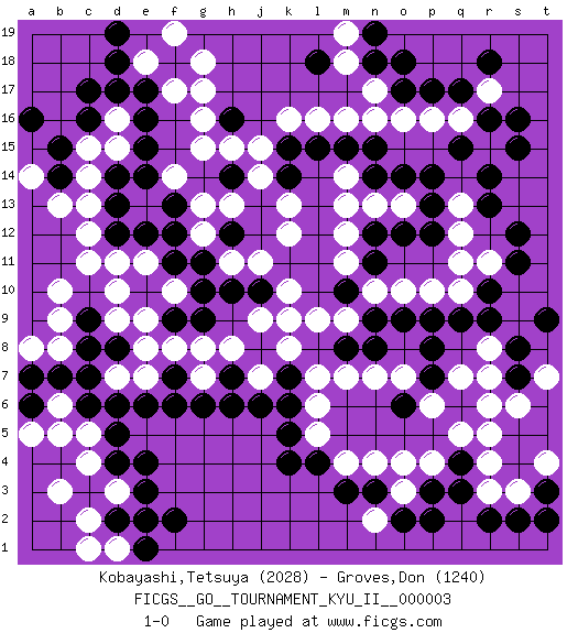 Last move : 1-0 2008 July 5 22:28:44 [Event "FICGS__GO__TOURNAMENT_KYU_II__000003"] [Site "FICGS"] [Date "2008.03.30"] [Round "1"] [Black "Kobayashi,Tetsuya"] [White "Groves,Don"] [Result "1-0"] [Rating 1 "2028"] [Rating 2 "1240"] 1.r16 c4 2.q3 p16 3.d17 c15 4.e4 r5 5.p17 q16 6.q17 r15 7.o17 o16 8.s15 r17 9.s16 n17 10.r18 n16 11.r14 g17 12.e16 g15 13.d14 c14 14.c16 d15 15.e15 c11 16.d13 c13 17.d12 c12 18.d6 c5 19.c6 d3 20.e3 e2 21.f2 c2 22.e1 p4 23.p3 o4 24.n3 n4 25.m3 m4 26.l4 l5 27.k4 s3 28.k5 l6 29.r10 r8 30.p9 q10 31.h16 g16 32.q9 q11 33.r9 q13 34.q15 o13 35.s12 j15 36.c9 d11 37.f13 d9 38.d8 e9 39.k6 l7 40.b15 d16 41.c17 e8 42.c8 g8 43.k7 k8 44.j8 k9 45.f7 e7 46.e6 g7 47.g6 j9 48.h14 h15 49.n18 m18 50.o18 j14 51.m10 o10 52.o9 n10 53.n9 m9 54.h12 k12 55.p14 h13 56.o14 n13 57.n14 m14 58.f18 f17 59.e17 g18 60.s8 r7 61.s7 s6 62.r2 f14 63.e14 g13 64.f12 g12 65.f11 j7 66.j6 b6 67.b7 b5 68.s2 r3 69.h7 h8 70.d2 c1 71.d4 e18 72.d18 f19 73.b14 j7 74.h6 b10 75.q6 r6 76.q4 q5 77.o6 p6 78.p7 q7 79.g11 h11 80.c3 b3 81.t3 o7 82.p8 n7 83.r13 r11 84.s11 o3 85.o2 t4 86.t2 r4 87.p12 p10 88.p13 q12 89.l18 m19 90.m15 m13 91.n15 m16 92.l15 l16 93.k15 k16 94.h10 j11 95.g10 n2 96.p2 b13 97.j10 k10 98.m8 l9 99.n8 m7 100.o12 a14 101.a16 t7 102.t9 d3 103.n12 m12 104.n11 m11 105.d19 d7 106.c7 e11 107.e12 f10 108.k14 k13 109.f9 f8 110.e10 d10 111.f6 b9 112.n19 b8 113.a6 a5 114.a7 a8 115.d5 f10 116.g9 d1 117.e2 1-0 Here are the names of the openings (joseki) played in the four corners : Corner q16 : r16 p16 Komoku (Somok, Xiao~mu`) 3-4 Point. The komoku (3-4) point is the traditional corner enclosure move.. Ikken Takagakari (Hankan Nop'dakeolch'im, Yi Gaogua`jiao~, 1-Space High Approach). The 5-4 approach move has become more popular in modern times, as modern Go emphasizes speed and influence. Corner d16 : d17 c15 Komoku (Somok, Xiao~mu`) 3-4 Point. The komoku (3-4) point is the traditional corner enclosure move.. Ikken Kakari (Hankan Keolch'im, Yi Gua`jiao~, 1-Space Low Pincer). The small knight move is the basic approach move to the 3-4 point stone. It has been continually used for over four centuries. There are limitless variations, with new moves constantly being discovered. White 2 opens the door to a treaure store of joseki. Corner d4 : c4 e4 Komoku (Somok, Xiao~mu`) 3-4 Point. The komoku (3-4) point is the traditional corner enclosure move.. Ikken Takagakari (Hankan Nop'dakeolch'im, Yi Gaogua`jiao~, 1-Space High Approach). The 5-4 approach move has become more popular in modern times, as modern Go emphasizes speed and influence. Corner q4 : q3 r5 Komoku (Somok, Xiao~mu`) 3-4 Point. The komoku (3-4) point is the traditional corner enclosure move.. Ikken Kakari (Hankan Keolch'im, Yi Gua`jiao~, 1-Space Low Pincer). The small knight move is the basic approach move to the 3-4 point stone. It has been continually used for over four centuries. There are limitless variations, with new moves constantly being discovered. White 2 opens the door to a treaure store of joseki. Player Black won this Go (weiqi, baduk) game. Follow this game move after move (download)A meijin needs no joseki. (Anonymous) I couldn't make any sense out of what this particular thread is about. It sounds like R2 D2 computer speaking. A space fight ?!? Some 'command' problems in Moscow ? Some killers & narcotic addicts attacking some game & a god wannabe ?? (Dinesh De Silva, lost in a russian conflict in FICGS forum)