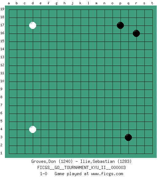 Last move : 1-0 2008 May 2 21:6:7 [Event "FICGS__GO__TOURNAMENT_KYU_II__000003"] [Site "FICGS"] [Date "2008.03.30"] [Round "1"] [Black "Groves,Don"] [White "Ilie,Sebastian"] [Result "1-0"] [Rating 1 "1240"] [Rating 2 "1283"] 1.r16 d17 2.q3 d4 3.p17 1-0 This go game has been lost on time (started : 2008.03.30 18:30:29) Here are the names of the openings (joseki) played in the four corners : Corner q4 : q3 1-0 Komoku (Somok, Xiao~mu`) 3-4 Point. The komoku (3-4) point is the traditional corner enclosure move.. Player Black won this Go (weiqi, baduk) game. Follow this game move after move (download)Go is not a blocking game, it's a game of action. (Pierre Audouard) He is a liar. I just don't know what the lie is yet. (Horatio Caine, C.S.I. Miami)