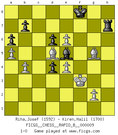 Last move : 1-0 2006 October 29 7:45:56 [Event "FICGS__CHESS__RAPID_B__000009"] [Site "FICGS"] [Date "2006.07.11"] [Round "1"] [White "Riha,Josef"] [Black "Kiren,Halil"] [Result "1-0"] [WhiteElo "1592"] [BlackElo "1700"] 1.d4 Nf6 2.c4 g6 3.Nc3 Bg7 4.e4 d6 5.Nf3 O-O 6.Be2 e5 7.O-O Nc6 8.d5 Ne7 9.b4 Ne8 10.Be3 f5 11.Qd3 f4 12.Bd2 h6 13.c5 g5 14.h3 Rf7 15.Nh2 Bf8 16.Bh5 Rh7 17.cxd6 cxd6 18.Rfc1 Nf6 19.Be2 h5 20.Nb5 Ng6 21.a4 g4 22.Kh1 Qb6 23.Rc2 Bd7 24.Rf1 a6 25.Nc7 Rd8 26.a5 Qd4 27.Ne6 Bxe6 28.dxe6 Nxe4 29.hxg4 hxg4 30.Qxd4 exd4 31.Kg1 g3 32.Ng4 Ne5 33.f3 Nxg4 34.fxe4 Nf2 35.Rxf2 gxf2+ 36.Kxf2 Be7 37.Kf3 Rf8 38.Bc4 Rc8 39.Rc1 Kf8 40.Bxf4 Rh4 41.Bd2 Bf6 42.Bd5 Rxc1 43.Bxc1 Rh1 44.Bd2 Rh7 45.Bf4 Be5 46.Bg5 1-0 This chess game has been lost on time (started : 2006.07.11 13:21:13) King's Indian : Orthodox, Aronin-Taimanov variation (Yugoslav attack / Mar del Plata variation) Kingside Castling by player Black (move 5) Kingside Castling by player White (move 7) Player White won this chess game. Follow this game move after move (download)Life is like a game of Chess, changing with each move. (Chinese proverb) Schach ist eine Sache der genauen Beurteilung, wann man zuschlagen und wann man sich ducken muss. (Robert James Fischer) Robert Fischer es la ley hacia si mismo. (Larry Evans) Aux échecs, l'amour-propre est satisfait quand on remporte la victoire, mais il n'y a pas de honte à être battu. (Benjamin Franklin) The problem with manipulation is that people can turn on you. (Horatio Caine, C.S.I. Miami)