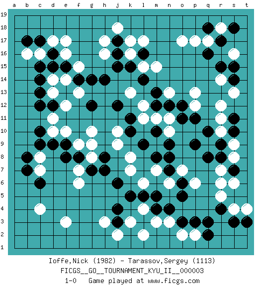 Last move : 1-0 2008 April 28 21:5:26 [Event "FICGS__GO__TOURNAMENT_KYU_II__000003"] [Site "FICGS"] [Date "2008.03.30"] [Round "1"] [Black "Ioffe,Nick"] [White "Tarassov,Sergey"] [Result "1-0"] [Rating 1 "1982"] [Rating 2 "1113"] 1.q16 c4 2.q3 c16 3.r9 e17 4.j4 e3 5.c10 r14 6.r15 r6 7.r4 p6 8.n4 r11 9.p9 n6 10.n9 l6 11.j6 k8 12.h8 j9 13.c6 h3 14.j3 n11 15.l9 k7 16.p11 p13 17.o12 n13 18.n12 l11 19.m12 m11 20.k10 j10 21.k11 l12 22.m13 k13 23.j12 p12 24.o11 g10 25.g12 g8 26.h7 f6 27.g7 f7 28.f8 c8 29.b8 c7 30.b7 g9 31.e9 e10 32.d9 e12 33.c13 f13 34.h14 h16 35.j15 k16 36.k15 l15 37.l14 m9 38.m10 n10 39.m8 q9 40.q10 s9 41.r8 s8 42.s7 r7 43.s10 r10 44.q8 s6 45.s11 r12 46.s14 s13 47.o6 o7 48.o5 o17 49.l16 m15 50.j16 k17 51.j17 l17 52.e15 f15 53.c15 l4 54.l3 m3 55.m4 k3 56.l5 l2 57.m5 j2 58.c17 b16 59.d16 d17 60.b17 e16 61.d15 h17 62.f14 e14 63.g14 j18 64.k5 o2 65.o3 p2 66.q2 n3 67.p3 s4 68.s3 t4 69.t3 q17 70.r17 r18 71.q18 p17 72.s18 r5 73.n7 s16 74.s15 m7 75.n8 f9 76.e8 d14 77.c14 d13 78.d12 d11 79.c12 d10 80.c9 1-0 Here are the names of the openings (joseki) played in the four corners : Corner d4 : c4 j4 Komoku (Somok, Xiao~mu`) 3-4 Point. The komoku (3-4) point is the traditional corner enclosure move.. Corner q16 : q16 r14 Hoshi (Hwajeom, Seongjeom, Xingwei`) 4-4 Point. The star or hoshi (4-4) point, emphasizing influence at the potential expense of territory. Ikken Kakari (Hankan Keolch'im, Yi Gua`jiao~, 1-Space Low Approach). White 2 is the standard approach move to the 4-4. Player Black won this Go (weiqi, baduk) game. Follow this game move after move (download)In opponents' sphere of influence, avoid sharp conflict, don't move too deep. (Otake Hideo, 9p) Memory is a way of holding onto the things you love, the things you are, the things you never want to lose. (from the television show: The Wonder Years)