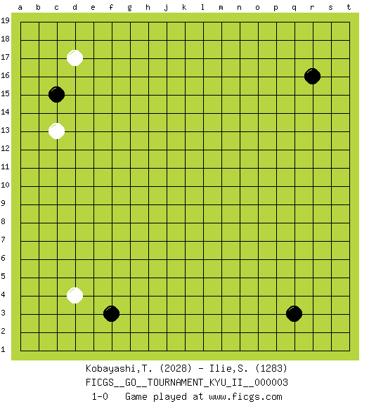 Last move : 1-0 2008 May 5 21:13:32 [Event "FICGS__GO__TOURNAMENT_KYU_II__000003 "] [Site "FICGS"] [Date "2008.03.30"] [Round "1"] [Black "Kobayashi,Tetsuya "] [White "Ilie,Sebastian "] [Result "1-0"] [Rating 1 "2028"] [Rating 2 "1283"] 1.r16 d17 2.q3 d4 3.c15 c13 4.f3 1-0 This go game has been lost on time (started : 2008.03.30 18:30:29) Here are the names of the openings (joseki) played in the four corners : Corner d16 : d17 c15Komoku (Somok, Xiao~mu`) 3-4 Point. The komoku (3-4) point is the traditional corner enclosure move..Ikken Kakari (Hankan Keolch'im, Yi Gua`jiao~, 1-Space Low Pincer). The small knight move is the basic approach move to the 3-4 point stone. It has been continually used for over four centuries. There are limitless variations, with new moves constantly being discovered. Black 2 opens the door to a treaure store of joseki. Corner d4 : d4 f3Hoshi (Hwajeom, Seongjeom, Xingwei`) 4-4 Point. The star or hoshi (4-4) point, emphasizing influence at the potential expense of territory.Ikken Kakari (Hankan Keolch'im, Yi Gua`jiao~, 1-Space Low Approach). Black 2 is the standard approach move to the 4-4. Player Black won this Go (weiqi, baduk) game.Follow this game move after move (download ) Be a little patient. Keshi works ! (Anonymous) If we don't succeed, we run the risk of failure. (George W. Bush)