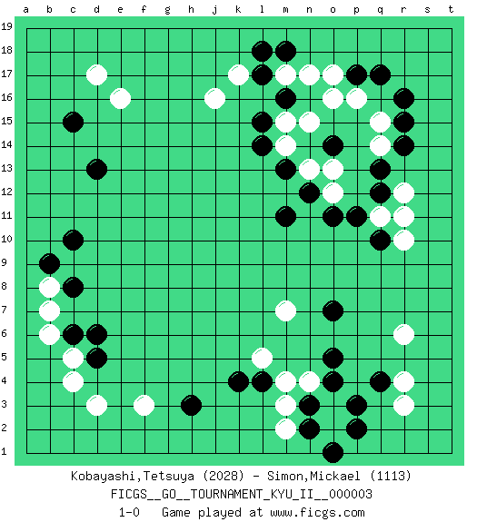 Last move : 1-0 2008 June 23 18:19:29 [Event "FICGS__GO__TOURNAMENT_KYU_II__000003 "] [Site "FICGS"] [Date "2008.03.30"] [Round "1"] [Black "Kobayashi,Tetsuya "] [White "Simon,Mickael "] [Result "1-0"] [Rating 1 "2028"] [Rating 2 "1113"] 1.r16 d17 2.q4 d3 3.c15 e16 4.d13 k17 5.d5 c5 6.c6 c4 7.d6 f3 8.c10 p16 9.p17 o17 10.q17 o16 11.r14 o3 12.l4 r6 13.o4 n4 14.o5 r3 15.p3 r4 16.n3 o2 17.p2 m3 18.n2 m4 19.h3 l5 20.k4 m2 21.o1 m7 22.o7 r10 23.m18 b8 24.c8 b6 25.b9 b7 26.m16 q14 27.q13 n15 28.l15 j16 29.m13 n13 30.n12 o13 31.m11 o12 32.q10 q15 33.r15 r12 34.q12 q11 35.p11 r11 36.o11 m17 37.l17 n17 38.l18 m15 39.l14 m14 40.o14 1-0 Here are the names of the openings (joseki) played in the four corners : Corner d16 : d17 c15Komoku (Somok, Xiao~mu`) 3-4 Point. The komoku (3-4) point is the traditional corner enclosure move..Ikken Kakari (Hankan Keolch'im, Yi Gua`jiao~, 1-Space Low Pincer). The small knight move is the basic approach move to the 3-4 point stone. It has been continually used for over four centuries. There are limitless variations, with new moves constantly being discovered. Black 2 opens the door to a treaure store of joseki. Corner d4 : d3 d5Komoku (Somok, Xiao~mu`) 3-4 Point. The komoku (3-4) point is the traditional corner enclosure move..Ikken Takagakari (Hankan Nop'dakeolch'im, Yi Gaogua`jiao~, 1-Space High Approach). The 5-4 approach move has become more popular in modern times, as modern Go emphasizes speed and influence. Corner q16 : r16 p16Komoku (Somok, Xiao~mu`) 3-4 Point. The komoku (3-4) point is the traditional corner enclosure move..Ikken Takagakari (Hankan Nop'dakeolch'im, Yi Gaogua`jiao~, 1-Space High Approach). The 5-4 approach move has become more popular in modern times, as modern Go emphasizes speed and influence. Corner q4 : q4 o3Hoshi (Hwajeom, Seongjeom, Xingwei`) 4-4 Point. The star or hoshi (4-4) point, emphasizing influence at the potential expense of territory.Ikken Kakari (Hankan Keolch'im, Yi Gua`jiao~, 1-Space Low Approach). White 2 is the standard approach move to the 4-4. Player Black won this Go (weiqi, baduk) game.Follow this game move after move (download ) To emphasize the lack of determination in his moves, one speaks of chance. (Pierre Audouard) Ah, the Socrating method. The best way we have of teaching everything-apart from juggling chainsaws. (Gregory House, House M.D.)