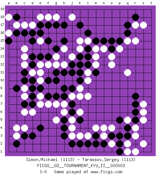 Last move : 1-0 2008 July 31 17:12:51 [Event "FICGS__GO__TOURNAMENT_KYU_II__000003"] [Site "FICGS"] [Date "2008.03.30"] [Round "1"] [Black "Simon,Mickael"] [White "Tarassov,Sergey"] [Result "1-0"] [Rating 1 "1113"] [Rating 2 "1113"] 1.q17 c4 2.q4 q15 3.d16 r17 4.r18 s17 5.q16 r15 6.p15 q11 7.e4 d6 8.c3 b3 9.d3 r3 10.q3 r4 11.r5 s5 12.r6 s6 13.r7 s7 14.r8 k3 15.h3 n3 16.c10 c8 17.k17 c17 18.c16 d17 19.e17 e18 20.f17 f18 21.g17 g18 22.h17 b17 23.b16 e10 24.d9 e8 25.e9 f9 26.d8 c9 27.d10 e11 28.c7 c12 29.b9 c6 30.d7 e7 31.f8 f7 32.g8 g9 33.h8 g5 34.b2 b4 35.f10 h10 36.g11 e15 37.e16 c14 38.d12 h12 39.h11 j10 40.j11 k15 41.l16 l15 42.m15 m14 43.n15 n14 44.o14 o12 45.k10 j8 46.j9 k9 47.h9 d11 48.c11 e12 49.d13 c13 50.e13 f12 51.f13 g12 52.f15 h14 53.l14 k12 54.j12 j13 55.l13 l10 56.k11 l11 57.l12 m12 58.k13 g13 59.d15 k14 60.g14 m13 61.k12 l8 62.j7 k8 63.h5 h6 64.j6 j5 65.h4 h7 66.g10 k6 67.m11 o13 68.h15 g7 69.k5 j4 70.m3 n4 71.n2 o2 72.k2 j3 73.j2 l3 74.l2 m4 75.m2 p14 76.o15 j18 77.a17 a18 78.b18 a16 79.a15 q2 80.r2 s2 81.p2 q1 82.p1 r1 83.o3 o4 84.p3 q5 85.p5 1-0 Here are the names of the openings (joseki) played in the four corners : Corner q16 : q17 q15 Komoku (Somok, Xiao~mu`) 3-4 Point. The komoku (3-4) point is the traditional corner enclosure move.. Ikken Takagakari (Hankan Nop'dakeolch'im, Yi Gaogua`jiao~, 1-Space High Approach). The 5-4 approach move has become more popular in modern times, as modern Go emphasizes speed and influence. Corner d4 : c4 e4 Komoku (Somok, Xiao~mu`) 3-4 Point. The komoku (3-4) point is the traditional corner enclosure move.. Ikken Takagakari (Hankan Nop'dakeolch'im, Yi Gaogua`jiao~, 1-Space High Approach). The 5-4 approach move has become more popular in modern times, as modern Go emphasizes speed and influence. Corner q4 : q4 r3 Hoshi (Hwajeom, Seongjeom, Xingwei`) 4-4 Point. The star or hoshi (4-4) point, emphasizing influence at the potential expense of territory. Corner d16 : d16 c17 Hoshi (Hwajeom, Seongjeom, Xingwei`) 4-4 Point. The star or hoshi (4-4) point, emphasizing influence at the potential expense of territory. Player Black won this Go (weiqi, baduk) game. Follow this game move after move (download)Knight's moves win running battles. (Anonymous) Inventor: A person who makes an ingenious arrangement of wheels, levers and springs, and believes it civilization. (Ambrose Bierce, The Devil's Dictionary)
