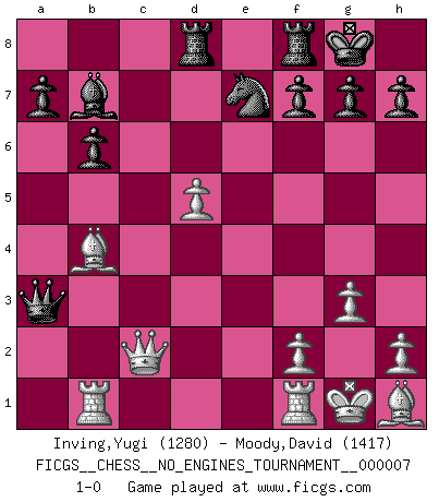 Last move : 1-0 2008 April 12 17:35:19 [Event "FICGS__CHESS__NO_ENGINES_TOURNAMENT__000007"] [Site "FICGS"] [Date "2008.04.01"] [Round "1"] [White "Inving,Yugi"] [Black "Moody,David"] [Result "1-0"] [WhiteElo "1280"] [BlackElo "1417"] 1.d4 Nf6 2.Nc3 e6 3.Nf3 d5 4.g3 Bb4 5.Bg2 c5 6.a3 Bxc3+ 7.bxc3 Ne4 8.O-O Nxc3 9.Qd3 Ne4 10.Nd2 Nxd2 11.Bxd2 cxd4 12.c3 Nc6 13.cxd4 O-O 14.Rab1 Qf6 15.Bc3 b6 16.e4 Bb7 17.exd5 exd5 18.Bxd5 Rad8 19.Bh1 Qd6 20.d5 Qxa3 21.Qc2 Ne7 22.Bb4 1-0 Queen's pawn game Kingside Castling by player White (move 8) Kingside Castling by player Black (move 13) Player White won this chess game. Follow this game move after move (download)Later, I began to succeed in decisive games. Perhaps because I realized a very simple truth: not only was I worried, but also my opponent. (Mikhail Tal) Es liegt in der Natur, vernüftig zu denken und unlogisch zu handeln. (Anatole France) El Ajedrez es un invernadero donde los frutos del carácter pueden madurar mas completamente que en la vida. (Edward Morgan Foster) Si rien de grave n'est détecté lors de l'analyse d'une position, on joue alors le coup. Seconde règle de Blumenfeld. Unless I accept my faults I will most certainly doubt my virtues. (Hugh Prather)