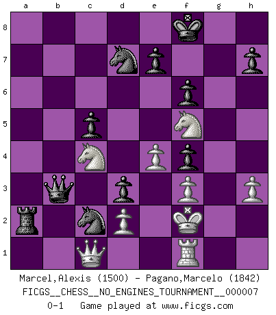 Last move : 0-1 2008 May 6 14:39:13 [Event "FICGS__CHESS__NO_ENGINES_TOURNAMENT__000007"] [Site "FICGS"] [Date "2008.04.01"] [Round "1"] [White "Marcel,Alexis"] [Black "Pagano,Marcelo"] [Result "0-1"] [WhiteElo "1500"] [BlackElo "1842"] 1.f4 b5 2.Nf3 Bb7 3.e3 b4 4.Be2 Nf6 5.O-O g6 6.b3 Bg7 7.Bb2 O-O 8.a3 a5 9.axb4 axb4 10.Rxa8 Bxa8 11.c3 Nd5 12.Qc2 bxc3 13.Nxc3 Nb4 14.Qb1 c5 15.Bc4 d5 16.Be2 d4 17.Nb5 Bc6 18.Na3 d3 19.Bd1 Bxb2 20.Qxb2 Nd7 21.Nc4 f6 22.h3 Qc7 23.Qc3 Be4 24.Qb2 Ra8 25.Nh2 Ra2 26.Qc3 Nd5 27.Qc1 Qa7 28.Ng4 Qa8 29.Bf3 Bxf3 30.gxf3 Nb4 31.Kg2 Nc2 32.e4 Qb8 33.Kg3 g5 34.Nh6+ Kf8 35.Nf5 gxf4+ 36.Kf2 Qxb3 0-1 Bird's Opening Kingside Castling by player White (move 5) Kingside Castling by player Black (move 7) Player Black won this chess game. Follow this game move after move (download)The passion for playing Chess is one of the most unaccountable in the world. (H.G. Wells) Ein Gewinn durch eine ungenaue Kombination, sei sie auch noch so vorzeigbar, erfüllt mich mit Schaudern. (Wilhelm Steinitz) El jugador blanco perdió porque fallo en recordar la coreccta continuación y tuvo que pensar por sí mismo las movidas. (Siegbert Tarrasch) Le thème de l'attaque double intervient d'une manière ou d'une autre dans l'immense majorité des combinaisons. (Youri Averbakh) Some people are so afraid to die that they never begin to live. (Henry Van Dyke)