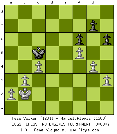 Last move : 1-0 2008 April 8 22:45:20 [Event "FICGS__CHESS__NO_ENGINES_TOURNAMENT__000007"] [Site "FICGS"] [Date "2008.04.01"] [Round "1"] [White "Hess,Volker"] [Black "Marcel,Alexis"] [Result "1-0"] [WhiteElo "1291"] [BlackElo "1500"] 1.e4 e5 2.Nf3 Nf6 3.Nxe5 d6 4.Nf3 Nxe4 5.Qe2 Qe7 6.d3 Nf6 7.Qxe7+ Bxe7 8.Be2 O-O 9.O-O Nc6 10.Nc3 Bg4 11.Be3 a6 12.Rfe1 b5 13.h3 Be6 14.Nd4 Nxd4 15.Bxd4 c5 16.Be3 b4 17.Ne4 Nxe4 18.dxe4 a5 19.f4 a4 20.f5 Bd7 21.Bc4 a3 22.b3 Rad8 23.Bd5 Bf6 24.Rad1 Bh4 25.Bf2 Bxf2+ 26.Kxf2 Bb5 27.Re3 Rfe8 28.c4 Bd7 29.Rde1 h6 30.g4 Re7 31.e5 dxe5 32.Rxe5 Rxe5 33.Rxe5 Rc8 34.Ke3 Bc6 35.Bxc6 Rxc6 36.Ke4 f6 37.Kd5 Rc8 38.Re6 Kf7 39.Rc6 Rxc6 40.Kxc6 Ke7 41.Kxc5 Kd7 42.Kxb4 Kc6 43.Kxa3 Kc5 44.Kb2 1-0 Petrov : Cozio (Lasker) attack Kingside Castling by player Black (move 8) Kingside Castling by player White (move 9) Player White won this chess game. Follow this game move after move (download)Fischer is the strongest player in the world. In fact, the strongest player who ever lived. (Larry Evans) Schach ist wie eine schöne Frau, zu der wir ständig zurückkehren, gleichviel, wie oft sie uns zurückweist. (Anonymous) Tu no necesitas jugar muy bien, únicamente ayudar a tu oponenet a que juegue muy mal. (Genrikh Chepukaitis) Les Echecs sont et restent toujours un combat, un combat intégral comme la boxe, la lutte ou un autre sport, et où il doit y avoir un vainqueur et un vaincu. (Joseph Emil Diemer) Statistics can be made to prove anything - even the truth. (Author unknown)