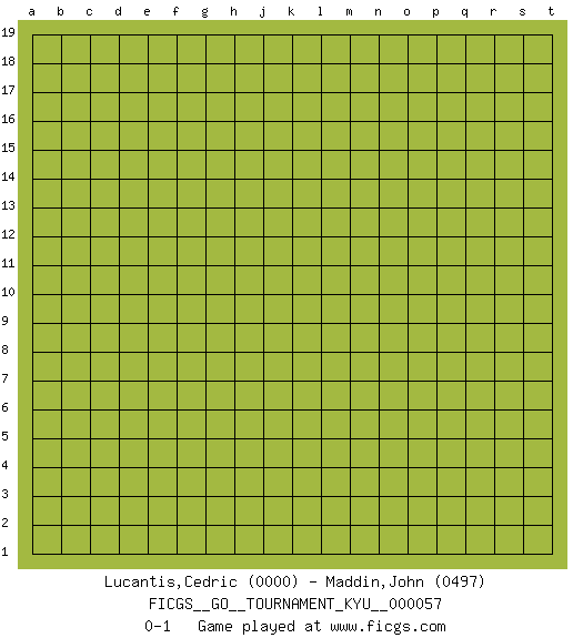 Last move : 0-1 2008 May 3 21:7:53 [Event "FICGS__GO__TOURNAMENT_KYU__000057"] [Site "FICGS"] [Date "2008.04.03"] [Round "1"] [Black "Lucantis,Cedric"] [White "Maddin,John"] [Result "0-1"] [Rating 1 "0000"] [Rating 2 "0497"] 0-1 This go game has been lost on time (started : 2008.04.03 15:57:47) Here are the names of the openings (joseki) played in the four corners : Player White won this Go (weiqi, baduk) game. Follow this game move after move (download)More haste less speed. (John Fairbairn) A journey of a thousand sites begins with a single click. (Author unknown)