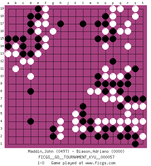 Last move : 1-0 2008 September 4 8:42:9 [Event "FICGS__GO__TOURNAMENT_KYU__000057"] [Site "FICGS"] [Date "2008.04.03"] [Round "1"] [Black "Maddin,John"] [White "Biason,Adriano"] [Result "1-0"] [Rating 1 "0497"] [Rating 2 "0000"] 1.d16 q4 2.d4 r16 3.r7 r5 4.r3 q3 5.q2 s3 6.s2 r4 7.r2 s4 8.p3 q7 9.q8 r6 10.s7 s6 11.t7 t6 12.t3 t4 13.q6 p4 14.o3 p7 15.r9 p8 16.p9 t2 17.s1 f17 18.h17 g16 19.l17 d10 20.d8 d12 21.c13 c12 22.d13 e13 23.e14 f14 24.e15 f15 25.e18 e17 26.d17 e16 27.c15 f18 28.e19 f19 29.d18 b13 30.c14 b14 31.b15 b11 32.a14 a13 33.a15 k3 34.m3 h3 35.g2 h2 36.g3 h4 37.l2 l3 38.l4 k4 39.l5 k5 40.l6 p17 41.n17 r14 42.q18 p18 43.q17 q16 44.p16 o16 45.p15 o14 46.o15 q19 47.r19 p19 48.r18 r17 49.o17 s18 50.o18 s19 51.n15 n4 52.m4 n3 53.n2 o4 54.o2 q10 55.q9 o10 56.p12 p10 57.o9 n8 58.o8 o7 59.n9 m8 60.n10 o11 61.r10 r11 62.s11 1-0 This go game has been lost on time (started : 2008.04.03 15:57:47) Here are the names of the openings (joseki) played in the four corners : Corner q4 : q4 r7 Hoshi (Hwajeom, Seongjeom, Xingwei`) 4-4 Point. The star or hoshi (4-4) point, emphasizing influence at the potential expense of territory. Nikken Kakari (Dukan Keolch'im, E`r Gua`jiao~, 2-Space Low Approach). White typically answers by 7-3 or 3-5 (which is not joseki). Corner d16 : d16 f17 Hoshi (Hwajeom, Seongjeom, Xingwei`) 4-4 Point. The star or hoshi (4-4) point, emphasizing influence at the potential expense of territory. Ikken Kakari (Hankan Keolch'im, Yi Gua`jiao~, 1-Space Low Approach). White 2 is the standard approach move to the 4-4. Corner q16 : r16 l17 Komoku (Somok, Xiao~mu`) 3-4 Point. The komoku (3-4) point is the traditional corner enclosure move.. Player Black won this Go (weiqi, baduk) game. Follow this game move after move (download)Don't get surrounded ! Ever ! (Anonymous) Internal peace cannot coexist with external war. (Don Groves)