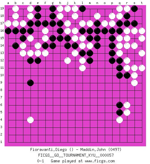 Last move : 0-1 2008 September 10 20:56:17 [Event "FICGS__GO__TOURNAMENT_KYU__000057"] [Site "FICGS"] [Date "2008.04.03"] [Round "1"] [Black "Fioravanti,Diego"] [White "Maddin,John"] [Result "0-1"] [Rating 2 "0497"] 1.q17 q4 2.d16 d4 3.d9 r16 4.q16 q15 5.r17 s16 6.s17 t16 7.p15 q14 8.p14 q13 9.q12 r12 10.r13 r14 11.s13 s14 12.s12 r11 13.s15 r15 14.t14 t15 15.p13 t13 16.t12 s11 17.t14 t11 18.m16 l17 19.l16 m17 20.n16 j17 21.h17 h18 22.h16 j16 23.h15 k16 24.j15 k15 25.g18 h19 26.j18 k18 27.k14 l15 28.m15 l14 29.l13 k13 30.j14 j12 31.m13 m14 32.n14 j19 33.g17 o17 34.n17 n18 35.o16 p17 36.q5 r5 37.q6 r6 38.q11 t13 39.p12 q18 40.p16 p18 41.n15 l12 42.m12 l11 43.g19 c17 44.r18 r19 45.s19 q19 46.l19 k19 47.d17 d18 48.e18 d19 49.e17 f15 50.f14 e14 51.g14 d15 52.c16 b17 53.r10 s10 54.b16 a17 55.a16 b18 56.q10 s9 57.g15 f16 58.f17 f13 59.c15 c14 60.b14 c13 61.e19 b19 62.d12 d13 63.e12 e13 0-1 Here are the names of the openings (joseki) played in the four corners : Corner d4 : d4 d9 Hoshi (Hwajeom, Seongjeom, Xingwei`) 4-4 Point. The star or hoshi (4-4) point, emphasizing influence at the potential expense of territory. Corner q16 : q17 r16 Komoku (Somok, Xiao~mu`) 3-4 Point. The komoku (3-4) point is the traditional corner enclosure move.. Corner d16 : d16 j17 Hoshi (Hwajeom, Seongjeom, Xingwei`) 4-4 Point. The star or hoshi (4-4) point, emphasizing influence at the potential expense of territory. Corner q4 : q4 q5 Hoshi (Hwajeom, Seongjeom, Xingwei`) 4-4 Point. The star or hoshi (4-4) point, emphasizing influence at the potential expense of territory. Player White won this Go (weiqi, baduk) game. Follow this game move after move (download)While the Baroque rules of chess could only have been created by humans, the rules of go are so elegant, organic, and rigorously logical that if intelligent life forms exist elsewhere in the universe, they almost certainly play go. (Edward Lasker, international chess master) The difference between perseverance and obstinacy is that one comes from a strong will, and the other from a strong won't. (Henry Ward Beecher)