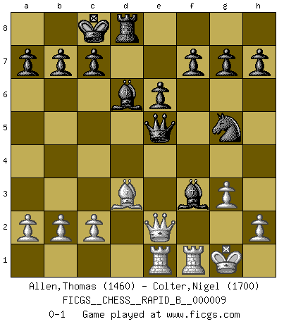 Last move : 0-1 2006 October 1 10:11:21 [Event "FICGS__CHESS__RAPID_B__000009"] [Site "FICGS"] [Date "2006.07.11"] [Round "1"] [White "Allen,Thomas"] [Black "Colter,Nigel"] [Result "0-1"] [WhiteElo "1460"] [BlackElo "1700"] 1.e4 e6 2.d4 d5 3.Nc3 dxe4 4.Nxe4 Bd7 5.Nf3 Bc6 6.Bd3 Nd7 7.Ne5 Nxe5 8.dxe5 Qd4 9.Qe2 Qxe5 10.O-O O-O-O 11.Rb1 Nf6 12.Bg5 Nxe4 13.Bxd8 Bd6 14.g3 Rxd8 15.Rbe1 Ng5 16.f3 Bxf3 0-1 This chess game has been lost on time (started : 2006.07.11 13:21:13) French : Fort Knox variation Kingside Castling by player White (move 10) Queenside Castling by player Black (move 10) Player Black won this chess game. Follow this game move after move (download)The blunders are all there on the board, waiting to be made. (Savielly Tartakover) Die unerbitterlichsten Regeln im Schach sind die Ausnahmen. (Savielly Grigorievitsch Tartakower) La maestría del Ajedrez consiste esencialmente en analizar posiciónes de Ajedrez con precisión. (Mikhail Botvinnik) Tout change constamment, y compris dans le monde des Echecs. (Botvinnik) The general who wins the battle makes many calculations in his temple before the battle is fought. The general who loses makes but few calculations beforehand. (Sun Tzu)