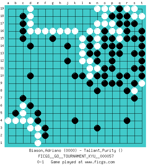 Last move : 0-1 2008 September 7 20:51:59 [Event "FICGS__GO__TOURNAMENT_KYU__000057"] [Site "FICGS"] [Date "2008.04.03"] [Round "1"] [Black "Biason,Adriano"] [White "Tallant,Purity"] [Result "0-1"] [Rating 1 "0000"] 1.r4 d4 2.r16 t15 3.s15 r14 4.t14 t13 5.t16 s14 6.t15 q16 7.s13 r13 8.t12 s12 9.t13 t11 10.s11 r11 11.t10 s10 12.t11 t9 13.r12 q12 14.r10 q11 15.s9 d16 16.k4 k16 17.r15 q15 18.q10 p10 19.q9 s8 20.r8 r17 21.s17 s18 22.q17 s12 23.s7 q18 24.r18 r19 25.r17 t18 26.p18 p19 27.f3 p17 28.q19 o18 29.o19 o17 30.p12 r12 31.p11 o10 32.q14 s19 33.p15 p16 34.o15 p14 35.q13 n15 36.o14 o13 37.o16 n16 38.p13 n14 39.p14 n19 40.n13 o12 41.o11 n11 42.n12 p19 43.q18 o19 44.n10 m11 45.o9 n9 46.p9 m10 47.o10 m12 48.m13 l13 49.m14 l14 50.m15 m16 51.m9 l15 52.d10 l12 53.n8 e16 54.l10 n17 55.k10 d17 56.d6 d3 57.e5 c4 58.d14 h16 59.j12 j16 60.j14 f16 61.g15 g16 62.n3 e2 63.f2 e3 64.e4 e1 65.b5 b4 66.c15 a4 67.c16 d18 68.c17 d19 69.c18 c6 70.c7 c5 0-1 This go game has been lost on time (started : 2008.04.03 15:57:47) Here are the names of the openings (joseki) played in the four corners : Corner q16 : r16 t15 Komoku (Somok, Xiao~mu`) 3-4 Point. The komoku (3-4) point is the traditional corner enclosure move.. Corner q4 : r4 t9 Komoku (Somok, Xiao~mu`) 3-4 Point. The komoku (3-4) point is the traditional corner enclosure move.. Corner d4 : d4 f3 Hoshi (Hwajeom, Seongjeom, Xingwei`) 4-4 Point. The star or hoshi (4-4) point, emphasizing influence at the potential expense of territory. Ikken Kakari (Hankan Keolch'im, Yi Gua`jiao~, 1-Space Low Approach). Black 2 is the standard approach move to the 4-4. Player White won this Go (weiqi, baduk) game. Follow this game move after move (download)Josekis are not fixed, definitive things. They indicate the moments when everything can change. (Pierre Audouard) No, no, you're not thinking; you're just being logical. (Niels Bohr)