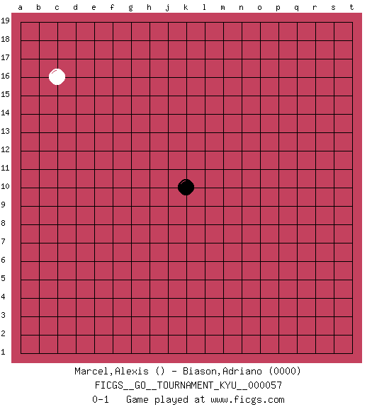 Last move : 0-1 2008 April 4 8:26:7 [Event "FICGS__GO__TOURNAMENT_KYU__000057"] [Site "FICGS"] [Date "2008.04.03"] [Round "1"] [Black "Marcel,Alexis"] [White "Biason,Adriano"] [Result "0-1"] [Rating 2 "0000"] 1.k10 c16 0-1 Here are the names of the openings (joseki) played in the four corners : Player White won this Go (weiqi, baduk) game. Follow this game move after move (download)At the head of two stones in a row, play hane. (Anonymous) Life doesn't imitate art, it imitates bad television. (Woody Allen)