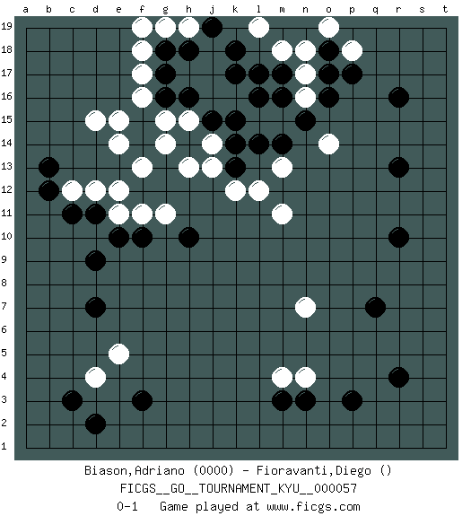 Last move : 0-1 2008 September 2 8:35:28 [Event "FICGS__GO__TOURNAMENT_KYU__000057"] [Site "FICGS"] [Date "2008.04.03"] [Round "1"] [Black "Biason,Adriano"] [White "Fioravanti,Diego"] [Result "0-1"] [Rating 1 "0000"] 1.r4 d4 2.p17 d15 3.p3 n16 4.r16 m4 5.k17 k16 6.l16 m15 7.k15 j16 8.h16 j17 9.m17 n17 10.j15 h17 11.m16 l15 12.k18 h15 13.g16 j13 14.h14 g15 15.f15 g14 16.k14 j14 17.k13 h13 18.g17 m18 19.l17 j18 20.j19 f16 21.f14 f13 22.n15 e14 23.m14 e15 24.o16 n18 25.h18 m11 26.r10 p18 27.o17 m13 28.l14 k12 29.q7 n7 30.d9 f17 31.d11 e11 32.d7 d12 33.c11 c12 34.e10 f11 35.f10 g11 36.f3 f18 37.n3 n4 38.m3 e5 39.d2 g19 40.r13 l12 41.c3 h19 42.g18 f19 43.b12 e12 44.h10 o14 45.b13 l19 46.o18 o19 0-1 This go game has been lost on time (started : 2008.04.03 15:57:47) Here are the names of the openings (joseki) played in the four corners : Corner q16 : p17 n16 Mokuhazushi (Waemok, Wai`mu`) 5-3 Point. The mokuhazushi (5-3) point was popular in the Edo period in Japan (1600 - 1867). It emphasizes influence; territorially, it is inferior to the 3-4 point. Corner d4 : d4 d9 Hoshi (Hwajeom, Seongjeom, Xingwei`) 4-4 Point. The star or hoshi (4-4) point, emphasizing influence at the potential expense of territory. Player White won this Go (weiqi, baduk) game. Follow this game move after move (download)Don't disturb symmetry. (Anonymous) Whenever people agree with me, I always feel I must be wrong. (Oscar Wilde)