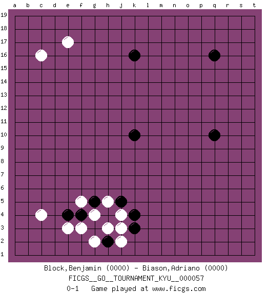 Last move : 0-1 2008 April 24 16:33:47 [Event "FICGS__GO__TOURNAMENT_KYU__000057"] [Site "FICGS"] [Date "2008.04.03"] [Round "1"] [Black "Block,Benjamin"] [White "Biason,Adriano"] [Result "0-1"] [Rating 1 "0000"] [Rating 2 "0000"] 1.k10 c16 2.q16 e3 3.k4 c4 4.q10 e17 5.k16 j3 6.g3 g4 7.e4 f3 8.f4 h3 9.h4 g2 10.h2 j2 11.k3 j4 12.j5 h5 13.g5 f5 0-1 Here are the names of the openings (joseki) played in the four corners : Player White won this Go (weiqi, baduk) game. Follow this game move after move (download)Take the cutting stone on the second line. (Anonymous) The right perception of any matter and a misunderstanding of the same matter do not wholly exclude each other. (Kafka's the trial)