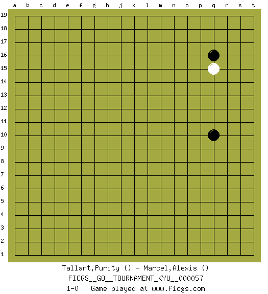 Last move : 1-0 2008 April 3 17:59:29 [Event "FICGS__GO__TOURNAMENT_KYU__000057"] [Site "FICGS"] [Date "2008.04.03"] [Round "1"] [Black "Tallant,Purity"] [White "Marcel,Alexis"] [Result "1-0"] 1.q16 q15 2.q10 1-0 Here are the names of the openings (joseki) played in the four corners : Corner q16 : q16 q15 Hoshi (Hwajeom, Seongjeom, Xingwei`) 4-4 Point. The star or hoshi (4-4) point, emphasizing influence at the potential expense of territory. Player Black won this Go (weiqi, baduk) game. Follow this game move after move (download)Pon-nuki is worth thirty points. (Anonymous) They misunderestimated me. (George W. Bush, Bentonville nov. 6, 2000)