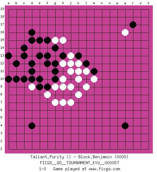Last move : 1-0 2008 April 17 18:2:28 [Event "FICGS__GO__TOURNAMENT_KYU__000057"] [Site "FICGS"] [Date "2008.04.03"] [Round "1"] [Black "Tallant,Purity"] [White "Block,Benjamin"] [Result "1-0"] [Rating 2 "0000"] 1.d4 k10 2.k11 q16 3.j10 j9 4.k9 j11 5.l10 k12 6.j8 h9 7.l12 h12 8.r17 h10 9.k13 j12 10.g12 k10 11.g11 l11 12.m11 k11 13.g8 l9 14.h13 m10 15.d16 k8 16.h8 j7 17.q4 h7 18.g10 g7 19.f9 f8 20.e9 g9 21.d15 f10 22.d10 d9 23.e10 f11 24.f12 e11 25.d12 e12 26.e13 c12 27.d11 d13 28.c13 d14 29.c14 e14 30.f15 f14 31.g14 g15 32.e15 h15 33.f13 j13 34.b12 c11 35.c10 b11 36.b10 a11 37.a10 a12 38.a13 1-0 Here are the names of the openings (joseki) played in the four corners : Corner d4 : d4 j9 Hoshi (Hwajeom, Seongjeom, Xingwei`) 4-4 Point. The star or hoshi (4-4) point, emphasizing influence at the potential expense of territory. Corner q16 : q16 l12 Hoshi (Hwajeom, Seongjeom, Xingwei`) 4-4 Point. The star or hoshi (4-4) point, emphasizing influence at the potential expense of territory. Corner q4 : l9 q4 This joseki is unknown. A weak or weird move has probably been played in this corner. Player Black won this Go (weiqi, baduk) game. Follow this game move after move (download)Big groups never die. (Anonymous) As a goal marker shodan is important. As a destination it is a poor place to stop. (Thomas Tamayo)