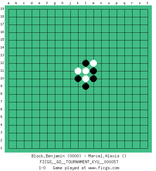 Last move : 1-0 2008 April 3 18:10:0 [Event "FICGS__GO__TOURNAMENT_KYU__000057"] [Site "FICGS"] [Date "2008.04.03"] [Round "1"] [Black "Block,Benjamin"] [White "Marcel,Alexis"] [Result "1-0"] [Rating 1 "0000"] 1.k10 l10 2.m10 l11 3.l12 k11 4.m11 m12 5.l9 1-0 Here are the names of the openings (joseki) played in the four corners : Corner q16 : l11 l12 This joseki is unknown. A weak or weird move has probably been played in this corner. Corner q4 : l9 1-0 This joseki is unknown. A weak or weird move has probably been played in this corner. Player Black won this Go (weiqi, baduk) game. Follow this game move after move (download)When your opponent is thick, you must also become thick. (Otake Hideo, 9p) War is the child of passion, passion is the child of narcissism and narcissism is the child. (...) Another game ? (Thibault de Vassal)