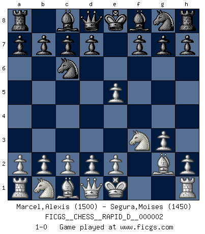 Last move : 1-0 2008 May 15 22:0:29 [Event "FICGS__CHESS__RAPID_D__000002"] [Site "FICGS"] [Date "2008.04.04"] [Round "1"] [White "Marcel,Alexis"] [Black "Segura,Moises"] [Result "1-0"] [WhiteElo "1500"] [BlackElo "1450"] 1.f4 e5 2.fxe5 Qh4+ 3.g3 Qd8 4.Bg2 Nc6 5.Nf3 1-0 This chess game has been lost on time (started : 2008.04.04 22:48:32) Bird : From gambit Player White won this chess game. Follow this game move after move (download)It's always better to sacrifice your opponent's men. (Savielly Tartakover) Du musst Deinen Gegner in einen tiefen dunklen Wald führen wo 2+2=5 ist und wo der Weg, der wieder hinausführt, nur breit genug für einen ist. (Mikhail Nekhemyevich Tal) Yo jugué Ajedrez con el y a veces le pude haber ganado solo que siempre devuelve su última jugada y juega la partida de manera diferente. (Mark Twain) Mais l'homme est une créature légère et illogique : semblable au joueur d'échecs, il n'aime que le processus du but à atteindre, non le but lui-même. (Dostoïevsky) A specialist learns more and more about less and less until he knows everything about nothing. (Nicholas Murray Butler)