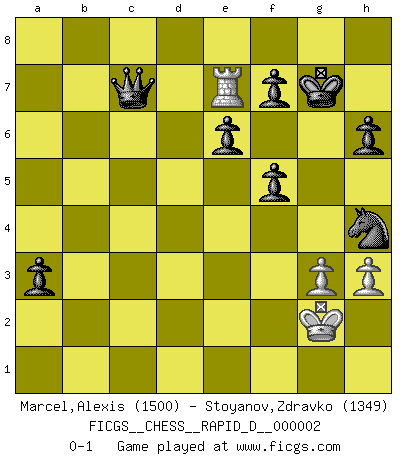 Last move : 0-1 2008 April 12 17:38:46 [Event "FICGS__CHESS__RAPID_D__000002"] [Site "FICGS"] [Date "2008.04.04"] [Round "1"] [White "Marcel,Alexis"] [Black "Stoyanov,Zdravko"] [Result "0-1"] [WhiteElo "1500"] [BlackElo "1349"] 1.f4 e6 2.Nf3 h6 3.e3 a6 4.b3 Nf6 5.Bb2 Be7 6.Be2 O-O 7.O-O b5 8.Nc3 Bb7 9.a3 c6 10.b4 c5 11.bxc5 Bxc5 12.Na2 Ne4 13.Nc3 Nxc3 14.Bxc3 Qc7 15.Qe1 Nc6 16.Ne5 b4 17.axb4 Nxb4 18.Qd1 Bxe3+ 19.dxe3 Qxc3 20.Nxd7 Rfd8 21.Rc1 Qxe3+ 22.Kh1 Bc6 23.Rf3 Bxf3 24.Bxf3 Ra7 25.Nf6+ gxf6 26.Qxd8+ Kg7 27.Rd1 Nxc2 28.Bh5 Qxf4 29.Kg1 Qg5 30.Bf3 Qc5+ 31.Kh1 Ne3 32.Re1 Qc3 33.Rb1 a5 34.Qb8 Rc7 35.h3 a4 36.Qa8 a3 37.Kh2 Nc4 38.Rb8 Qe5+ 39.Kh1 Qe1+ 40.Kh2 Qe5+ 41.g3 f5 42.Rg8+ Kf6 43.Qd8+ Re7 44.Re8 Qc7 45.Qd4+ Ne5 46.Qh4+ Kg7 47.Rxe7 Nxf3+ 48.Kg2 Nxh4+ 0-1 Bird's Opening Kingside Castling by player Black (move 6) Kingside Castling by player White (move 7) Player Black won this chess game. Follow this game move after move (download)Chess is a matter of delicate judgment, knowing when to punch and how to duck. (Bobby Fischer) Dieses schreckliche Gefühl, dass ich gegen eine Maschine spielte, die niemals Fehler macht, zerschmetterte meinen Widerstand. (Mark Taimanov) Observen a Garry Kasparov. Después de una derrota, invariablemente el gana la próxima partida. Prácticamente hace pedazos a su siguiente oponente. Eso es algo que tenemos que aprender a lograr. (Maurice Ashley) Je menace de comprendre la position. (Anonyme) Do you know these so called Volunteers don't even get paid! (Simpsons)