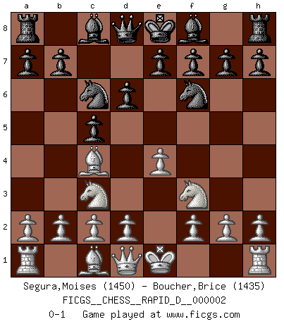 Last move : 0-1 2008 May 16 10:5:7 [Event "FICGS__CHESS__RAPID_D__000002"] [Site "FICGS"] [Date "2008.04.04"] [Round "1"] [White "Segura,Moises"] [Black "Boucher,Brice"] [Result "0-1"] [WhiteElo "1450"] [BlackElo "1435"] 1.e4 c5 2.Bc4 d6 3.Nc3 Nf6 4.Nf3 Nc6 0-1 This chess game has been lost on time (started : 2008.04.04 22:48:32) Sicilian defense Player Black won this chess game. Follow this game move after move (download)I like to say that Bobby Fischer was the greatest player ever. But what made Fischer a genius was his ability to blend an American freshness and pragmatism with Russian ideas about strategy. (Bruce Pandolfini) Jeder leidlich begabte Spieler, er braucht keineswegs hervorragend veranlagt zu sein, kann es zum Meister bringen. Aber das ist ja auch gar nicht nötig! Der richtige Standpunkt ist es, zu seinem Vergnügen zu spielen, und man glaube ja nicht, dass der Genuss proportional dem Können sei. (Siegbert Tarrasch) El Ajedrez, como cualquier actividad creativa, solo puede existir a través del esfuerzo combinado de aquellos que tienen talento creativo y de aquellos que poseen la habilidad de organizar su trabajo creativo. (Mikhail Botvinnik) Même si vous avez un bon coup à faire, regardez toujours s'il n'y en a pas un qui lui soit préférable. (Pedro Damiano) 'preceded by its own quotation yields a falsehood' preceded by its own quotation yields a falsehood. (W. V. O. Quine - Set Theory And Its Logic, 1953)