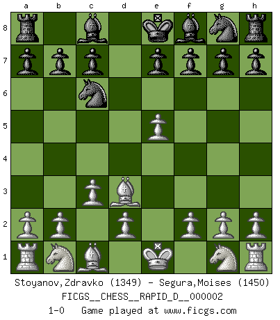 Last move : 1-0 2008 May 12 9:41:1 [Event "FICGS__CHESS__RAPID_D__000002"] [Site "FICGS"] [Date "2008.04.04"] [Round "1"] [White "Stoyanov,Zdravko"] [Black "Segura,Moises"] [Result "1-0"] [WhiteElo "1349"] [BlackElo "1450"] 1.e4 d5 2.e5 d4 3.c3 d3 4.Qf3 Nc6 5.Qxd3 Qxd3 6.Bxd3 1-0 This chess game has been lost on time (started : 2008.04.04 22:48:32) Scandinavian (centre counter) defense Player White won this chess game. Follow this game move after move (download)In a gambit you give up a Pawn for the sake of getting a lost game. (Samuel Standige Boden) Viele Opfer benötigen überhaupt keine konkrete Berechnung. Es genügt sich die entstehende Position kurz vorzustellen, um uns davon zu überzeugen, dass das Opfer korrekt ist. (Mikhail Nekhemyevich Tal) Juega la Apertura como un libro, el Juego Medio como un mago y los Finales como una máquina. (Spielmann) Les écrivains ont utilisé les échecs pour analyser les côtés extrêmes de la nature humaine. Dans ce cadre, les échecs offrent un champ d'expérimentation idéal. Mais on pourrait faire la même chose avec la peinture. Et là, en vous référant à Van Gogh, vous ne tirerez pas de conclusion définitive sur les peintres. (Gary Kasparov) Your best chance to get a Royal Flush in a casino is in the bathroom. (Anonymous)