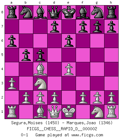 Last move : 0-1 2008 May 12 9:41:1 [Event "FICGS__CHESS__RAPID_D__000002"] [Site "FICGS"] [Date "2008.04.04"] [Round "1"] [White "Segura,Moises"] [Black "Marques,Joao"] [Result "0-1"] [WhiteElo "1450"] [BlackElo "1346"] 1.e4 c5 2.Bc4 e6 3.Nc3 a6 4.a3 b5 0-1 This chess game has been lost on time (started : 2008.04.04 22:48:32) Sicilian defense Player Black won this chess game. Follow this game move after move (download)I prefer to lose a really good game than to win a bad one. (David Levy) Karpov ist ein Museumsstück. (Garry Kasparov) El ganador de una partida es aquel jugador que hace el penúltimo error. (Savielly Tartakover) Nous vivons dans un monde échiquéen : chaque jour qui passe est un défi à relever. (Philosophe Sasha) The only thing that matters is the evidence. (Horatio Caine, C.S.I. Miami)
