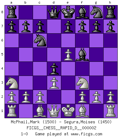 Last move : 1-0 2008 May 10 21:32:30 [Event "FICGS__CHESS__RAPID_D__000002"] [Site "FICGS"] [Date "2008.04.04"] [Round "1"] [White "McPhail,Mark"] [Black "Segura,Moises"] [Result "1-0"] [WhiteElo "1500"] [BlackElo "1450"] 1.e4 d5 2.e5 d4 3.d3 Nc6 4.Nf3 Bf5 5.Na3 1-0 This chess game has been lost on time (started : 2008.04.04 22:48:32) Scandinavian (centre counter) defense Player White won this chess game. Follow this game move after move (download)If your opponent cannot do anything active, then don't rush the position; instead you should let him sit there, suffer, and beg you for a draw. (Jeremy Silman) Ich war zu klein für die Schach-Schülermannschaft! (Woody Allen) Haz el enroque temprano y seguido. (Rob Sillars) La guerre est enfant de la passion, la passion est enfant du narcissisme et le narcissisme est l'enfant. (...) Une autre partie ? (Thibault de Vassal) It's not enough to succeed. Others must fail. (Gore Vidal)