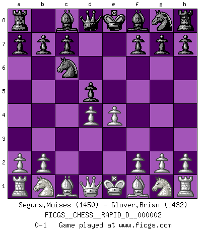 Last move : 0-1 2008 May 10 21:32:30 [Event "FICGS__CHESS__RAPID_D__000002"] [Site "FICGS"] [Date "2008.04.04"] [Round "1"] [White "Segura,Moises"] [Black "Glover,Brian"] [Result "0-1"] [WhiteElo "1450"] [BlackElo "1432"] 1.e4 e5 2.d4 exd4 3.c3 Nc6 4.cxd4 d5 0-1 This chess game has been lost on time (started : 2008.04.04 22:48:32) Danish gambit Player Black won this chess game. Follow this game move after move (download)Fischer prefers to enter Chess history alone. (Miguel Najdorf) Fischer: 'Remis!?' Uhlmann: 'Aber es muss doch dreimal Zugwiederholung sein!' Fischer: 'Sie nehmen das Remis an, wie ich es sage, sonst spiele ich weiter und werde Sie dann schlagen!' (Robert James Fischer) Bobby es el jugador de Ajedrez mas fino que este país jamás haya producido. Su memoria para las movidas, su brillantez en soñar combinaciones y su feróz determinación por la victoria son algo extraño. (John Collins) Les réformistes prétendent que les progrès de la théorie conduiront à la disparition des échecs, et qu'il faut, pour leur rendre vie, en remanier les règles. En réalité, qu'exprime cette affirmation? Le mépris de l'intuition, de l'imagination et de tous les autres éléments qui font des échecs un art. (Alexander Alekhine) I find television to be very educating. Every time somebody turns on the set, I go in the other room and read a book. (Groucho Marx)