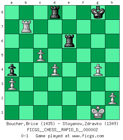 Last move : 0-1 2008 May 30 21:29:19 [Event "FICGS__CHESS__RAPID_D__000002"] [Site "FICGS"] [Date "2008.04.04"] [Round "1"] [White "Boucher,Brice"] [Black "Stoyanov,Zdravko"] [Result "0-1"] [WhiteElo "1435"] [BlackElo "1349"] 1.c4 e6 2.Nc3 Nf6 3.g3 c6 4.Bg2 Bb4 5.Qc2 O-O 6.Nf3 Qb6 7.O-O h6 8.d3 d5 9.a3 Bxc3 10.Qxc3 Nbd7 11.Be3 c5 12.b4 Qd6 13.Bf4 Qe7 14.bxc5 Nxc5 15.Qb4 b6 16.d4 a5 17.Qxb6 Ncd7 18.Qd6 Qxd6 19.Bxd6 Re8 20.Ne5 Ra6 21.c5 Nxe5 22.Bxe5 Ng4 23.Bd6 Nf6 24.f3 Rc6 25.e4 Ba6 26.Rfe1 Bc4 27.Rab1 Bd3 28.Rb7 a4 29.exd5 Nxd5 30.f4 Bc4 31.f5 Ra6 32.fxe6 fxe6 33.Bf1 Bxf1 34.Rxf1 Ne3 35.R1f7 Nf5 36.Be5 Rf8 37.Rfd7 Kh7 38.Bxg7 Rc8 39.g4 Nxg7 40.Rxg7+ Kh8 41.Rh7+ Kg8 42.Rxh6 Rd8 43.Rxe6 Rxe6 0-1 English Opening Kingside Castling by player Black (move 5) Kingside Castling by player White (move 7) Player Black won this chess game. Follow this game move after move (download)Don't even mention losing to me. I can't stand to think of it. (Bobby Fischer) Um dein Spiel zu verbessern musst du zuallererst das Endspiel studieren, denn diese kann unabhängig studiert werden. Die Eröffnung und das Mittelspiel müssen immer in Bezug gesetzt werden zum Endspiel. (José Raúl Capablanca) La última cosa en que Fischer estaba interesado era en tonterías, siempre y cuando el Ajedrez estuviera involucrado. (Elie Agur) La tactique est l'élément le plus important du milieu de jeu. (Siegbert Tarrasch) To be champion requires more than simply being a strong player; one has to be a strong human being as well. (Anatoly Karpov)