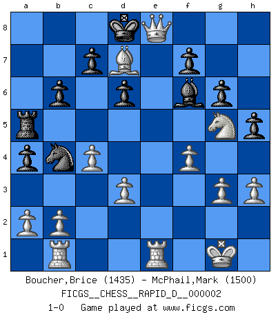 Last move : 1-0 2008 May 10 2:27:59 [Event "FICGS__CHESS__RAPID_D__000002"] [Site "FICGS"] [Date "2008.04.04"] [Round "1"] [White "Boucher,Brice"] [Black "McPhail,Mark"] [Result "1-0"] [WhiteElo "1435"] [BlackElo "1500"] 1.c4 e5 2.Nc3 Nf6 3.g3 d6 4.Bg2 Nc6 5.d3 g6 6.Nf3 a5 7.O-O Nd4 8.Nxd4 exd4 9.Ne4 Ng4 10.Rb1 a4 11.h3 Ne5 12.e3 dxe3 13.Bxe3 h5 14.f4 Nc6 15.Re1 Be6 16.Ng5 Bf5 17.Bd4 Be7 18.Bxh8 Nb4 19.Be4 Qd7 20.Bf6 Bxf6 21.Bxf5 Kd8 22.Bxd7 Ra5 23.Qe2 b6 24.Qe8+ 1-0 English : Carls' Bremen system Kingside Castling by player White (move 7) Player White won this chess game. Follow this game move after move (download)At this time Fischer is simply a level above all the best Chessplayers in the world. (John Jacobs) Im Schach gibt es keinen Platz für Galanterie. (Irving Chernev) Botvinnik trataba de restarle el misterio al Ajedrez, siempre relacionandolo a situaciones de la vida ordinaria. El gustaba de llamar al Ajedrez un típico problema inexacto similar a aquellos de los cuales la gente siempre tiene que enfrentarse en la vida cotidiana. (Garry Kasparov) L'ordinateur a tué l'originalité. Il n'y a plus guère d'aventures sur l'échiquier. (Jacob Murray) Philosophers use a language that is already deformed as though by shoes that are too tight. (Ludwig Wittgenstein)