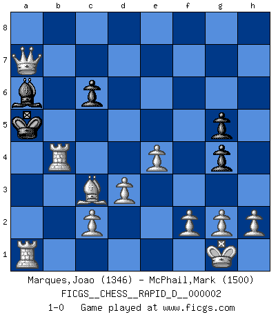 Last move : 1-0 2008 April 29 2:47:5 [Event "FICGS__CHESS__RAPID_D__000002"] [Site "FICGS"] [Date "2008.04.04"] [Round "1"] [White "Marques,Joao"] [Black "McPhail,Mark"] [Result "1-0"] [WhiteElo "1346"] [BlackElo "1500"] 1.e4 e5 2.Nf3 Nf6 3.Nxe5 Nc6 4.Nxc6 bxc6 5.Nc3 Qe7 6.d3 Ba6 7.Bg5 h6 8.Bh4 g5 9.Bg3 Rb8 10.Rb1 Qe6 11.Bxc7 Rb5 12.Nxb5 Bxb5 13.a3 Nh5 14.Qxh5 a5 15.Be2 Rh7 16.O-O Rg7 17.Bg4 Qe5 18.Bxe5 Bc5 19.Bxg7 Kd8 20.Qxf7 Kc7 21.Qxd7+ Kb6 22.b4 axb4 23.axb4 Bxb4 24.Rxb4 h5 25.Bd4+ Ka5 26.Bc3 hxg4 27.Qa7+ Ba6 28.Ra1+ 1-0 Petrov's defense Kingside Castling by player White (move 16) Player White won this chess game. Follow this game move after move (download)You need not play well - just help your opponent to play badly. (Genrikh Chepukaitis) Es ist nicht das erste mal, dass sich die FIDE dem Arabischen Geld gebeugt hat (über die FIDE WM 2004 in Lybien). (Larry Evans) Por esta medida (el intervalo entre Fischer y sus contemporaneos), yo le considero el mas grande campeón mundial. (Garry Kasparov) Les Echecs ne sont pas pour les âmes timides. Ils requièrent un homme entier, qui ne s'arrête pas aveuglément à ce qui a été déjà établi, mais qui tente individuellement de sonder les profondeurs du jeu. (W. Steinitz) Rules and bones are meant to be broken. (Anonymous)