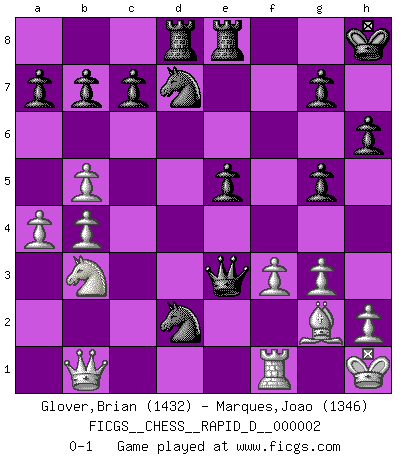 Last move : 0-1 2008 June 24 0:20:35 [Event "FICGS__CHESS__RAPID_D__000002"] [Site "FICGS"] [Date "2008.04.04"] [Round "1"] [White "Glover,Brian"] [Black "Marques,Joao"] [Result "0-1"] [WhiteElo "1432"] [BlackElo "1346"] 1.d4 Nf6 2.Nf3 e6 3.Bg5 Be7 4.Nc3 O-O 5.g3 d6 6.Bg2 Nc6 7.e4 Bd7 8.Qd2 Ng4 9.O-O Bxg5 10.Nxg5 Qf6 11.f3 Nh6 12.e5 dxe5 13.dxe5 Nxe5 14.Nce4 Qe7 15.Rae1 Nc4 16.Qc3 Bb5 17.b3 Nb6 18.Rf2 Nd5 19.Qb2 f6 20.c4 fxg5 21.cxb5 Qb4 22.R2f1 Nf7 23.a4 h6 24.Bh3 Rfe8 25.Rf2 Qxe1+ 26.Rf1 Qe3+ 27.Kh1 Rad8 28.b4 Nd6 29.Nc5 Nb6 30.Qb1 Nd7 31.Nb3 e5 32.Qa2 Kh8 33.Qb1 Nc4 34.Bg2 Nd2 0-1 Queen's pawn : Torre attack Kingside Castling by player Black (move 4) Kingside Castling by player White (move 9) Player Black won this chess game. Follow this game move after move (download)Your body has to be in top condition. Your Chess deteriorates as your body does. You can't separate body from mind. (Bobby Fischer) Mit Schach schule ich mein Gefühl für Geometrie, was für Tennis und Schach gleichermaßen wichtig ist. (Boris Becker) En posiciones complicadas, Bobby Fischer pocas veces tuvo que temer de cualquiera. (Paul Keres) Votre prénom est 'Tactique', votre deuxième prénom est 'Tactique' et votre nom est 'Tactique'. (Ken Smith) When I took office, only high energy physicists had ever heard of what is called the World Wide Web... Now even my cat has its own page. (Bill Clinton, 1996)
