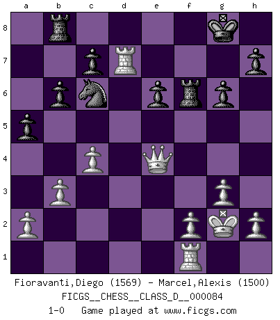 Last move : 1-0 2008 August 24 19:3:50 [Event "FICGS__CHESS__CLASS_D__000084"] [Site "FICGS"] [Date "2008.04.05"] [Round "1"] [White "Fioravanti,Diego"] [Black "Marcel,Alexis"] [Result "1-0"] [WhiteElo "1569"] [BlackElo "1500"] 1.d4 f5 2.g3 Nf6 3.c4 e6 4.Bg2 Be7 5.Nh3 O-O 6.O-O Nc6 7.Nc3 a6 8.Nf4 b6 9.d5 Na5 10.d6 Rb8 11.dxe7 Qxe7 12.b3 Bb7 13.Bb2 Bxg2 14.Kxg2 Qb4 15.Qc2 Nc6 16.Rad1 Qe7 17.e4 fxe4 18.Nxe4 Nxe4 19.Qxe4 a5 20.Nh5 g6 21.Nf6+ Qxf6 22.Bxf6 Rxf6 23.Rxd7 1-0 Dutch defense Kingside Castling by player Black (move 5) Kingside Castling by player White (move 6) Player White won this chess game. Follow this game move after move (download)Human affairs are like a Chess game: only those who do not take it seriously can be called good players. (Hung Tzu Ch'eng) Kleine Schachspieler machen Mist, und große Schachspieler machen Mist, aber große machen weniger Mist. (Fritz Sämisch) Haz el enroque temprano y seguido. (Rob Sillars) Le jeu d'échecs est comme rejeté hors du temps. (Antoine de Saint-Exupéry) A mistake is only a mistake if you let it happen twice. Otherwise it is a learning experience. (Daniel Parmet)