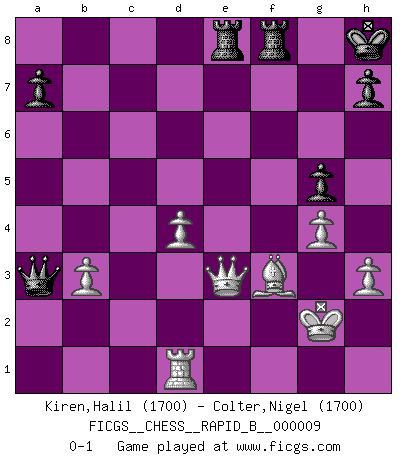 Last move : 0-1 2006 October 31 13:59:8 [Event "FICGS__CHESS__RAPID_B__000009"] [Site "FICGS"] [Date "2006.07.11"] [Round "1"] [White "Kiren,Halil"] [Black "Colter,Nigel"] [Result "0-1"] [WhiteElo "1700"] [BlackElo "1700"] 1.d4 e6 2.c4 f5 3.g3 Nf6 4.Bg2 Be7 5.Nf3 O-O 6.O-O c6 7.Nc3 d5 8.b3 Ne4 9.Qc2 Nd7 10.Rd1 Qe8 11.Bf4 Qh5 12.a3 g5 13.Bc7 Ndf6 14.Ne5 Bd7 15.f3 Nd6 16.Nxd7 Nxd7 17.Bxd6 Bxd6 18.e4 fxe4 19.fxe4 Nf6 20.exd5 exd5 21.cxd5 Ng4 22.h3 Ne3 23.Qd3 Nxd1 24.Rxd1 cxd5 25.Bxd5+ Kh8 26.Kg2 Rac8 27.g4 Qe8 28.Ne4 Qe7 29.Nxd6 Qxd6 30.Bxb7 Rb8 31.Bf3 Qxa3 32.Qe3 Rbe8 0-1 This chess game has been lost on time (started : 2006.07.11 13:21:13) Queen's pawn Kingside Castling by player Black (move 5) Kingside Castling by player White (move 6) Player Black won this chess game. Follow this game move after move (download)Fischer is an American Chess tragedy on par with Morphy and Pillsbury. (Mig Greengard) Dein Körper muss in Topform sein. Dein Schach verfällt, wenn dein Körper verfällt. Der Körper kann nicht vom Geist getrennt werden. (Robert James Fischer) Dios mío, Bobby Fischer juega tan simple. (Alexei Suetin) Un journaliste : 'Vous préférez avoir une dame de plus sur l'échiquier ou au lit ?' Boris Spassky : 'Ca dépend de la position.' Somehow our devils are never quite what we expect when we meet them face to face. (Nelson DeMille)