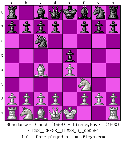 Last move : 1-0 2008 May 17 22:9:27 [Event "FICGS__CHESS__CLASS_D__000084"] [Site "FICGS"] [Date "2008.04.05"] [Round "1"] [White "Bhandarkar,Dinesh"] [Black "Cicala,Pavel"] [Result "1-0"] [WhiteElo "1569"] [BlackElo "1800"] 1.e4 e5 2.Nf3 Nc6 3.Bc4 1-0 This chess game has been lost on time (started : 2008.04.05 10:44:22) King's pawn game Player White won this chess game. Follow this game move after move (download)Human affairs are like a Chess game: only those who do not take it seriously can be called good players. (Hung Tzu Ch'eng) Ein Teil des Fehlers ist immer korrekt. (Savielly Grigorievitsch Tartakower) El Ajedrez moderno está demasiado preocupado con cosas como la estructura de Peones. Olvidenlo, el Jaque Mate termina la partida. (Nigel Short) Le profane ne songe pas à la somme de jouissance dont il se prive, qui méconnaît ce jeu aux ressources aussi variées que passionnantes. (Jean-Marie Jeanton-Lamarche) Before all elsed, be armed. (Niccolo Machiavelli)