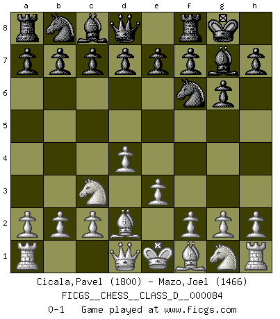 Last move : 0-1 2008 May 19 10:17:37 [Event "FICGS__CHESS__CLASS_D__000084"] [Site "FICGS"] [Date "2008.04.05"] [Round "1"] [White "Cicala,Pavel"] [Black "Mazo,Joel"] [Result "0-1"] [WhiteElo "1800"] [BlackElo "1466"] 1.d4 Nf6 2.e3 g6 3.Nc3 Bg7 4.Bd2 O-O 0-1 This chess game has been lost on time (started : 2008.04.05 10:44:22) Queen's pawn game Kingside Castling by player Black (move 4) Player Black won this chess game. Follow this game move after move (download)Chess books should be used as we use glasses: to assist the sight, although some players make use of them as if they thought they conferred sight. (Jose Raul Capablanca) Gegen einen Schachcomputer zu verlieren ist wie Löcher in den Strümpfen zuhaben. Es ist nicht peinlich, solange man der einzige ist der es weiß. (Anonymous) Debemos de asegurarnos de que el Ajedrez no se convierta en un lenguaje muerto, muy interesante, pero tan solo para un grupo muy pequeño. (Sytze Faber) Vouloir jouer aux échecs contre soi-même est aussi paradoxal que vouloir marcher sur son ombre. (Stefan Zweig) Now you put water in a cup, it becomes the cup; You put water into a bottle it becomes the bottle; You put it in a teapot it becomes the teapot. Water can flow or it can crash. Be water, my friend. (Bruce Lee)