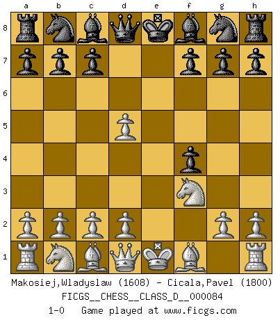 Last move : 1-0 2008 May 19 10:17:37 [Event "FICGS__CHESS__CLASS_D__000084"] [Site "FICGS"] [Date "2008.04.05"] [Round "1"] [White "Makosiej,Wladyslaw"] [Black "Cicala,Pavel"] [Result "1-0"] [WhiteElo "1608"] [BlackElo "1800"] 1.e4 e5 2.f4 exf4 3.Nf3 d5 4.exd5 1-0 This chess game has been lost on time (started : 2008.04.05 10:44:22) KGA : Abbazia defense (Classical defense, Modern defense!) Player White won this chess game. Follow this game move after move (download)You sit at the board and suddenly your heart leaps. Your hand trembles to pick up the piece and move it. But what Chess teaches you is that you must sit there calmly and think about whether it's really a good idea and whether there are other better ideas. (Stanley Kubrick) Taktik ist was man tun muß, wenn etwas zu tun ist. Strategie ist was man tun muß, wenn nichts zu tun ist. (Savielly Grigorievitsch Tartakower) Del Ajedrez se ha dicho que la vida no es lo suficientemente larga para él, pero eso es culpa de la vida, no del Ajedrez. (William Ewart Napier) Les Echecs ne sont pas pour les âmes timides. Ils requièrent un homme entier, qui ne s'arrête pas aveuglément à ce qui a été déjà établi, mais qui tente individuellement de sonder les profondeurs du jeu. (W. Steinitz) Games, world of games... There's always an opponent, and there's always a victim. (Revolver, movie)