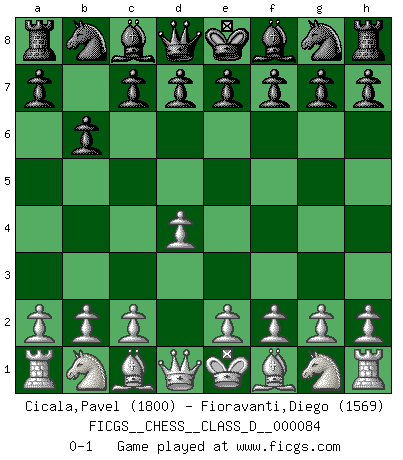 Last move : 0-1 2008 May 17 22:9:27 [Event "FICGS__CHESS__CLASS_D__000084"] [Site "FICGS"] [Date "2008.04.05"] [Round "1"] [White "Cicala,Pavel"] [Black "Fioravanti,Diego"] [Result "0-1"] [WhiteElo "1800"] [BlackElo "1569"] 1.d4 b6 0-1 This chess game has been lost on time (started : 2008.04.05 10:44:22) Queen's pawn : English defense Player Black won this chess game. Follow this game move after move (download)The isolated Pawn casts gloom over the entire chessboard. (Aaron Nimzovich) Ich kämpfe solange mein Gegner einen Fehler machen kann. (Emanuel Lasker) El Ajedrez es despiadado: debes de estar preparado para matar gente. (Nigel Short) Des combinaisons [dans le jeu d'échecs] pareilles à des mélodies. Je crois entendre pour ainsi dire la musique des coups... (Vladimir Nabokov) Waiting for chance ? Play in casinos. (FICGS proverb)