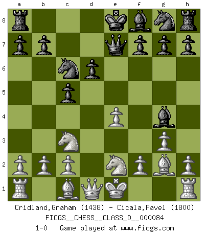 Last move : 1-0 2008 May 17 10:8:22 [Event "FICGS__CHESS__CLASS_D__000084"] [Site "FICGS"] [Date "2008.04.05"] [Round "1"] [White "Cridland,Graham"] [Black "Cicala,Pavel"] [Result "1-0"] [WhiteElo "1438"] [BlackElo "1800"] 1.e4 e5 2.Nf3 d6 3.d4 exd4 4.Nxd4 Qe7 5.Nc3 c5 6.Nde2 Nc6 7.g3 Bg4 8.Bg2 1-0 This chess game has been lost on time (started : 2008.04.05 10:44:22) Philidor : Exchange variation Player White won this chess game. Follow this game move after move (download)Blessed be the memory of him who gave the world this immortal game. (A. G. Gardiner) Ich glaube, ich kenne inzwischen die Gründe für mein Versagen: schachliche Charakterfehler. Ich war nie ein Wunderkind und in meiner gesamten menschlichen Entwicklung immer zu langsam. (Viktor Kortschnoi) El Ajedrez es de 30 a 40 por ciento psicología. Uno no cuenta con esto cuando se juega contra una computadora. No lo puedo confundir. (Judith Polgar) Fischer est le meilleur joueur du monde et Karpov n'est qu'un joueur de bistrot. (Garry Kasparov, agé de 16 ans) The only thing that overcomes hard luck is hard work. (Harry Golden)