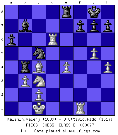 Last move : 1-0 2008 December 9 1:58:19 [Event "FICGS__CHESS__CLASS_C__000077"] [Site "FICGS"] [Date "2008.04.05"] [Round "1"] [White "Kalinin,Valery"] [Black "D Ottavio,Aldo"] [Result "1-0"] [WhiteElo "1689"] [BlackElo "1617"] 1.e4 c5 2.Nf3 d6 3.d4 cxd4 4.Nxd4 Nf6 5.Nc3 a6 6.Bg5 e6 7.f4 Be7 8.Qf3 Qc7 9.O-O-O Nbd7 10.g4 b5 11.Bxf6 Nxf6 12.g5 Nd7 13.a3 Rb8 14.h4 b4 15.axb4 Rxb4 16.b3 Bb7 17.Qe3 Nc5 18.Bc4 O-O 19.f5 exf5 20.Nxf5 Re8 21.Qd4 Ne6 22.Nxe7+ Qxe7 23.Qxd6 Qxd6 24.Rxd6 Nc5 25.Rf1 1-0 This chess game has been lost on time (started : 2008.04.05 13:50:13) Sicilian : Najdorf, 7...Be7 Queenside Castling by player White (move 9) Kingside Castling by player Black (move 18) Player White won this chess game. Follow this game move after move (download)A Chess game is divided into three stages: the first, when you hope you have the advantage, the second when you believe you have an advantage, and the third... when you know you're going to lose ! (Savielly Tartakower) Im Schach gewinnt jeder. Hat man Freunde am Spiel - und das ist die Hauptsache - ist auch der Verlust einer Partie kein Unglück. (David Bronstein) En manos de Fischer's, una diminuta ventaja teórica es tan buena como tener una Reina de ventaja. (Isaac Kashdan) La guerre est enfant de la passion, la passion est enfant du narcissisme et le narcissisme est l'enfant. (...) Une autre partie ? (Thibault de Vassal) The human is the only animal species whose members are able to talk themselves into difficulties that would not otherwise exist. (Wendell Johnson)