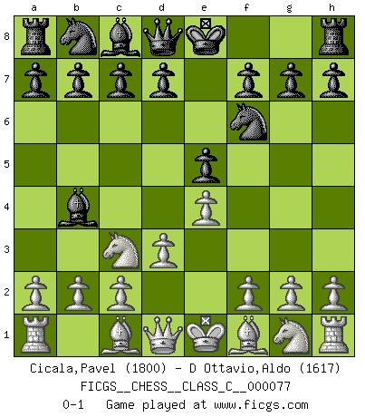 Last move : 0-1 2008 May 23 10:30:2 [Event "FICGS__CHESS__CLASS_C__000077"] [Site "FICGS"] [Date "2008.04.05"] [Round "1"] [White "Cicala,Pavel"] [Black "D Ottavio,Aldo"] [Result "0-1"] [WhiteElo "1800"] [BlackElo "1617"] 1.d3 e5 2.e4 Nf6 3.Nc3 Bb4 0-1 This chess game has been lost on time (started : 2008.04.05 13:50:13) Mieses Opening Player Black won this chess game. Follow this game move after move (download)I don't believe in psychology. I believe in good moves. (Bobby Fischer) Schachspieler können ausgezeichnet Varianten am Schachbrett berechnen, aber nicht im realen Leben. Zu stark ist der Individualismus im Schach ausgeprägt, und für viele ist ein kleiner momentaner persönlicher Vorteil wichtiger als ein weit größerer Vorteil von morgen. (Anatoly Karpov) Coloca el contenido de las piezas del Ajedrez en un sombrero, agitalo vigorosamente, arrojalas en un tablero desde una altura de 30 centimetros y así obtendras el estilo de Steinitz. (H. E. Bird) Seul un grand joueur sait à quel point il joue faiblement. (Xavier Tartacover) He who defends everything defends nothing. (Frederick the Great)