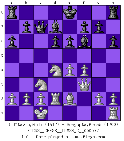 Last move : 1-0 2008 May 17 19:18:6 [Event "FICGS__CHESS__CLASS_C__000077"] [Site "FICGS"] [Date "2008.04.05"] [Round "1"] [White "D Ottavio,Aldo"] [Black "Sengupta,Arnab"] [Result "1-0"] [WhiteElo "1617"] [BlackElo "1700"] 1.e4 c5 2.Nf3 d6 3.d4 cxd4 4.Nxd4 Nf6 5.Nc3 a6 6.Bg5 e6 7.f4 Be7 8.Qf3 Qc7 9.O-O-O h6 10.Bxf6 Bxf6 11.Be2 Bd7 12.Rd2 Nc6 13.Nb3 Nd4 14.Nxd4 1-0 Sicilian : Najdorf, 7...Be7 Queenside Castling by player White (move 9) Player White won this chess game. Follow this game move after move (download)Personally, I rather look forward to a computer program winning the world Chess Championship. Humanity needs a lesson in humility. (Richard Dawkings) Im Internet Chess Club betrug mein Rating vorübergehend 3350 ELO-Punkte. (Sergej Karjakin) El Peón aislado arroja penumbra sobre todo el tablero. (Aaron Nimzovich) Lorsque vous vous retrouvez devant une position atroce, ne tendez pas un ultime piège dérisoire avec l'intention d'abandonner si l'adversaire le déjoue ! Faites-vous plutôt un devoir de résister comme si votre vie en dépendait. Jouez le coup qui vous déplairait au centuple si vous étiez dans la peau de votre tortionnaire ! The only sure thing about luck is that it will change. (Wilson Mizner)